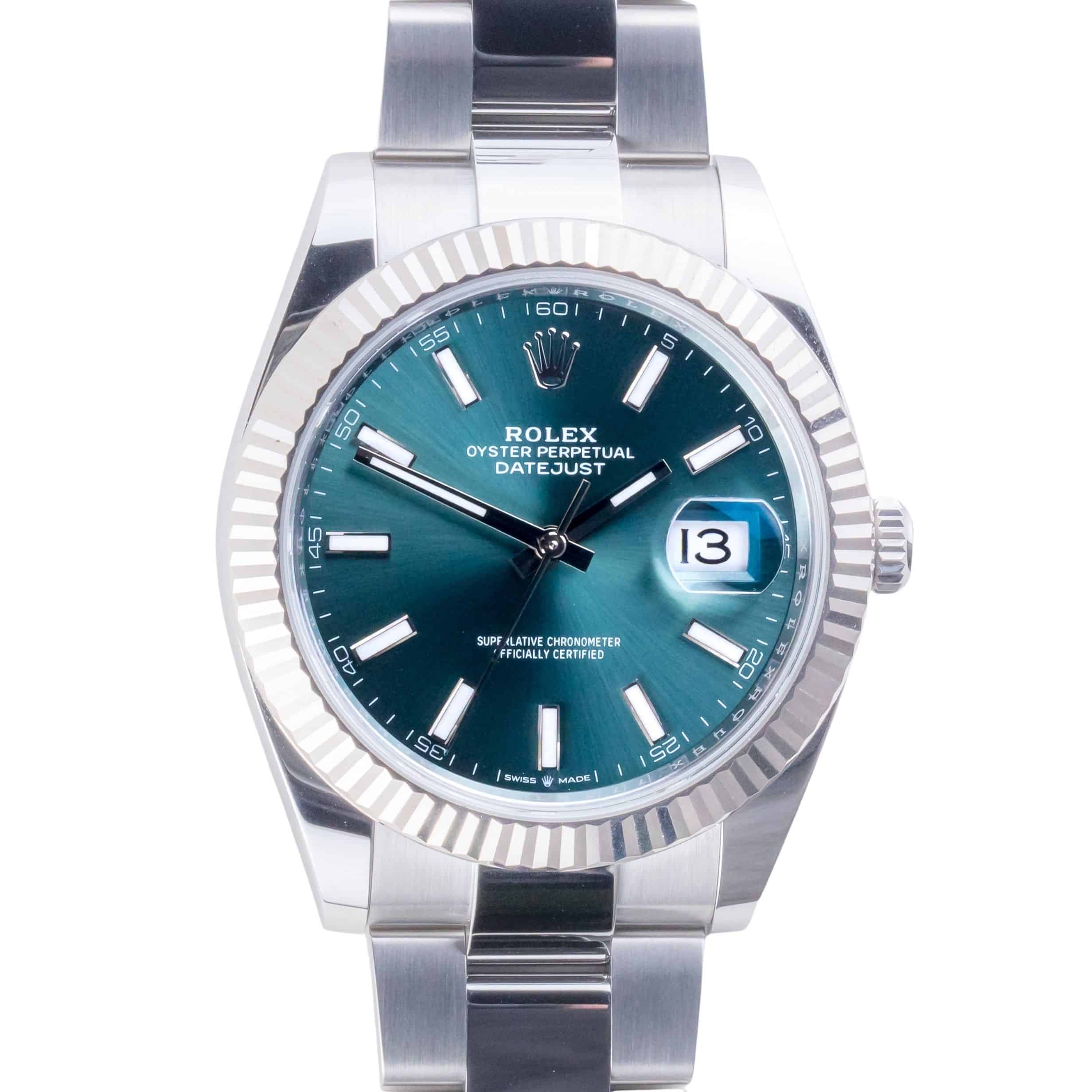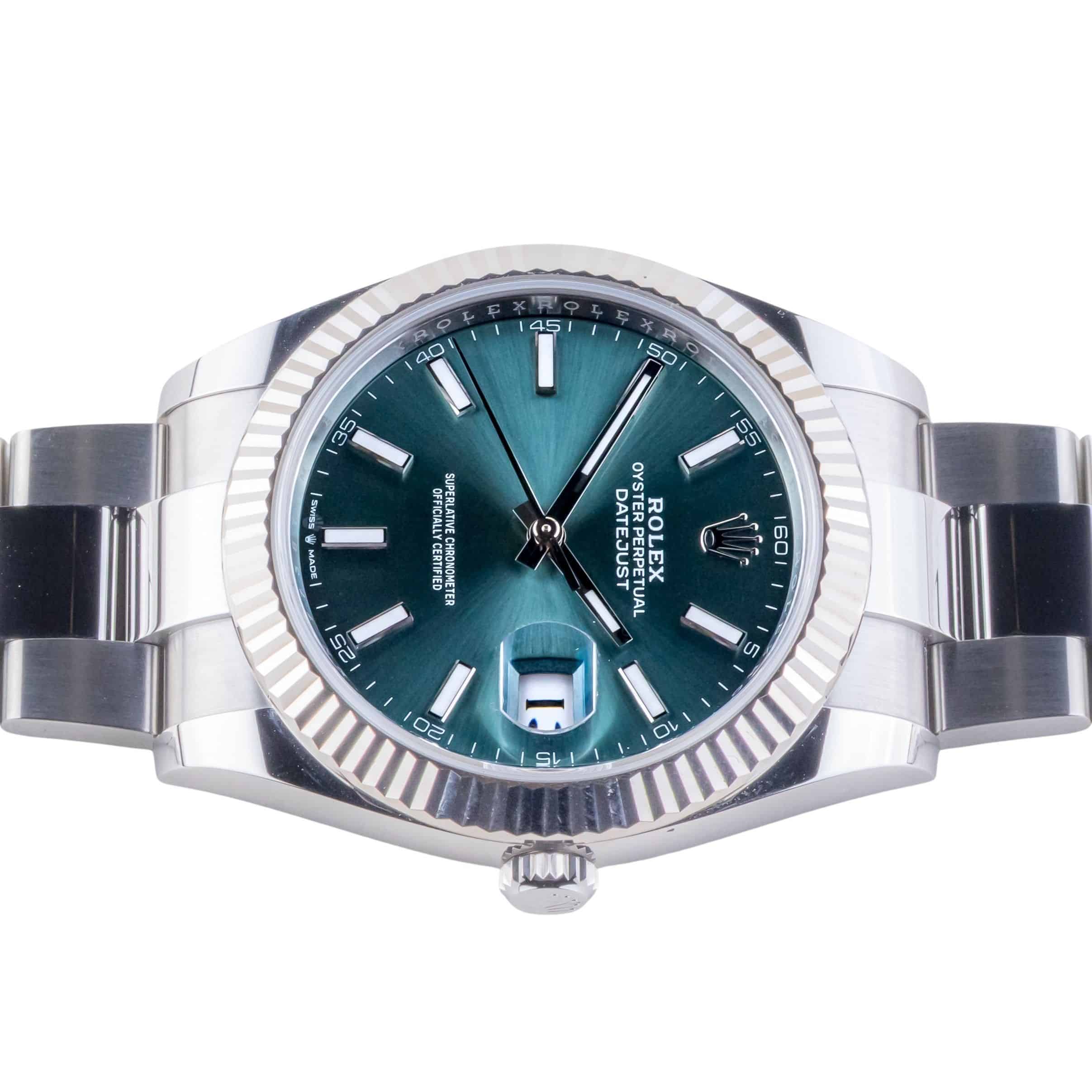 NEW Rolex Oyster Perpetual Datejust reference 126334 from 2025 including full set. The Datejust 126334 measures a 41mm stainless steel case, a stainless steel (904L) Oyster bracelet with Oysterclasp and a fluted 18K white gold bezel. This Datejust 126334 features an automatic movement caliber 3235 with a quickset date function, a scratch resistance sapphire crystal and a mint green dial.
