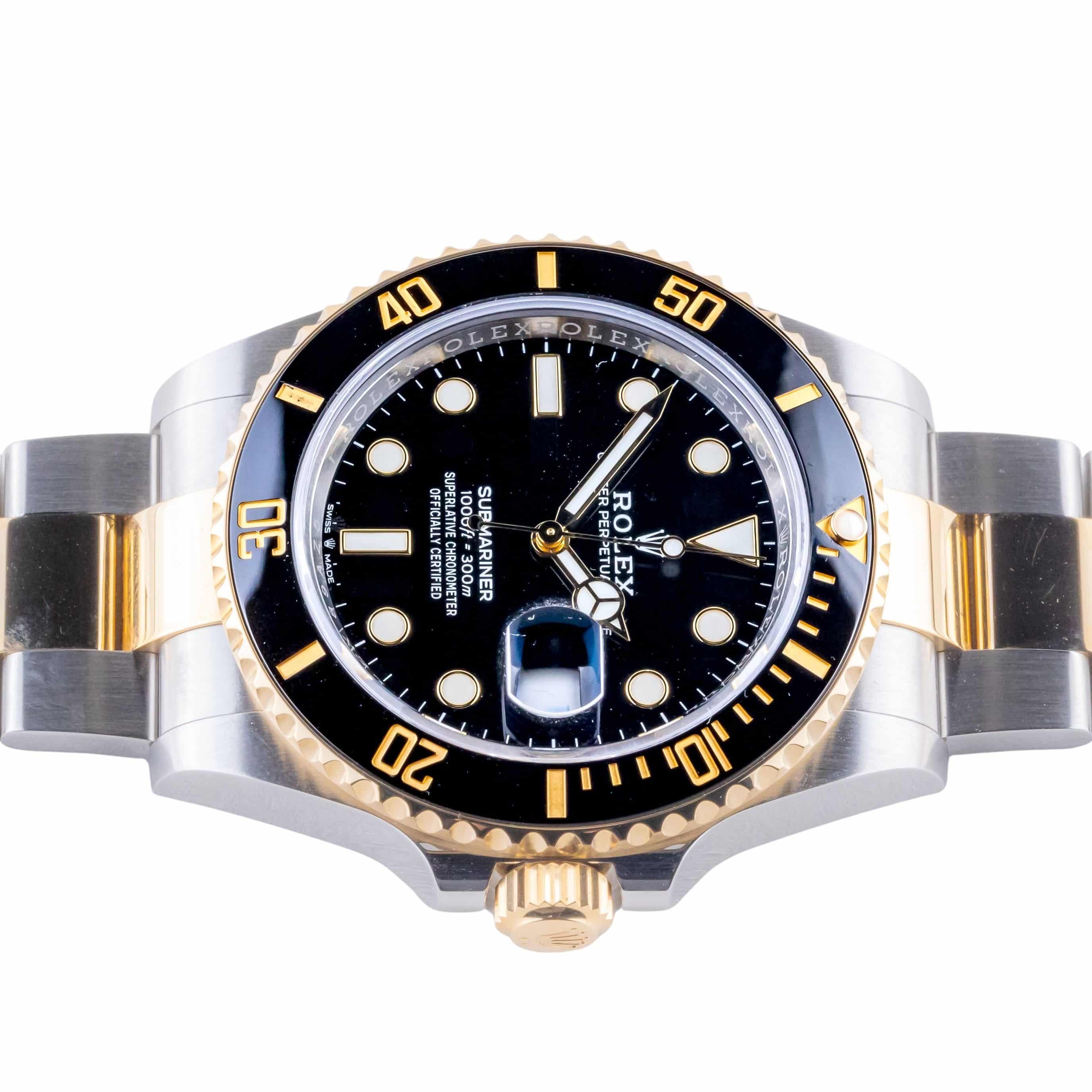 Rolex Submariner Date reference 126613LN including full set from 2021. The Submariner Date measures a 41mm Gold/ stainless steel case, a Gold/ stainless steel Oyster bracelet w/ Oysterlock clasp and a ceramic (rotatable) black bezel. The Submariner Date 126613LN features an automatic movement caliber 3235, a scratch resistance sapphire crystal, and a black dial with chromalight display.