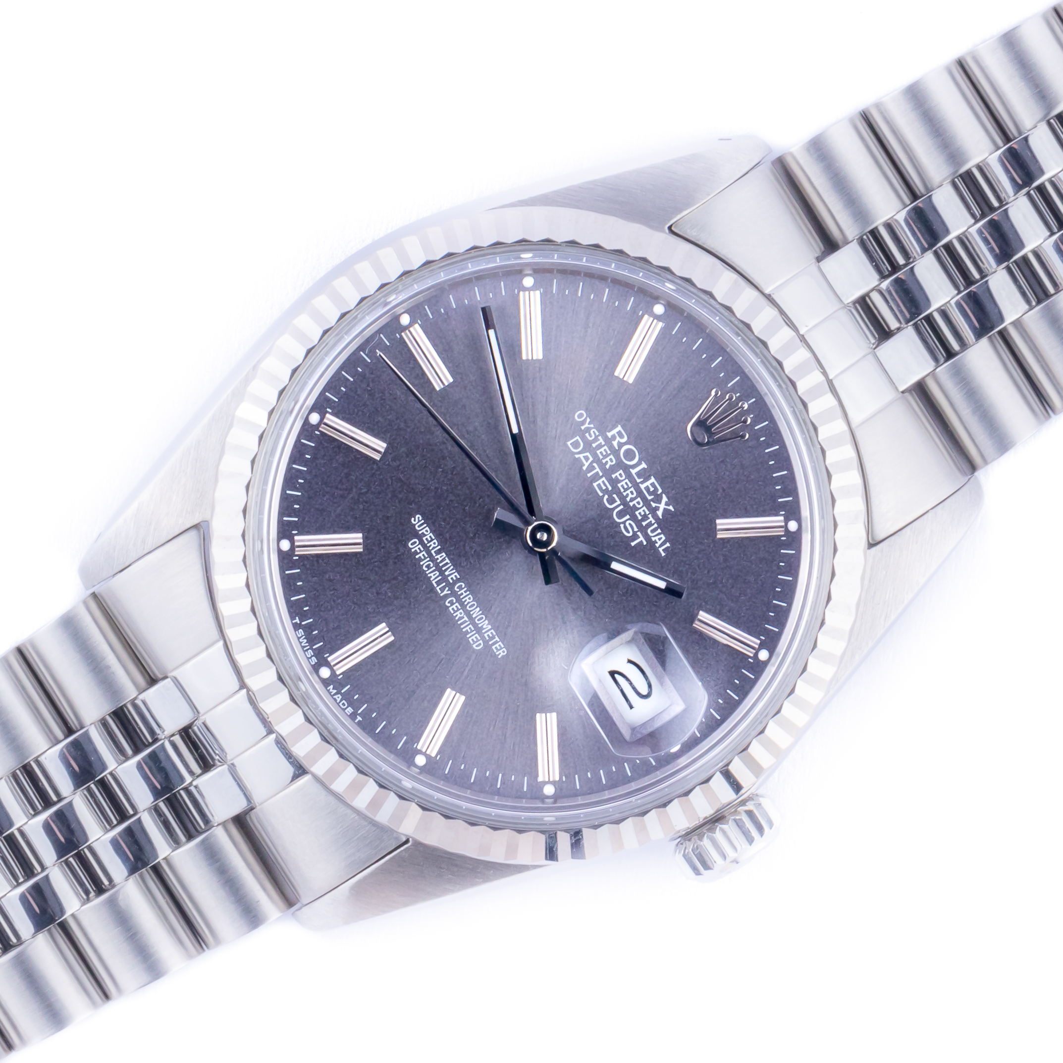 Rolex Oyster Perpetual Datejust reference 16014 from 1984 including full set. The Datejust 16014 measures a 36mm stainless steel case with a 18k white gold bezel and stainless steel Jubilee bracelet. The Datejust 16014 features an automatic movement caliber 3035 with quickset date function, a water resistance plexi glass and a grey dial with tritium hands.