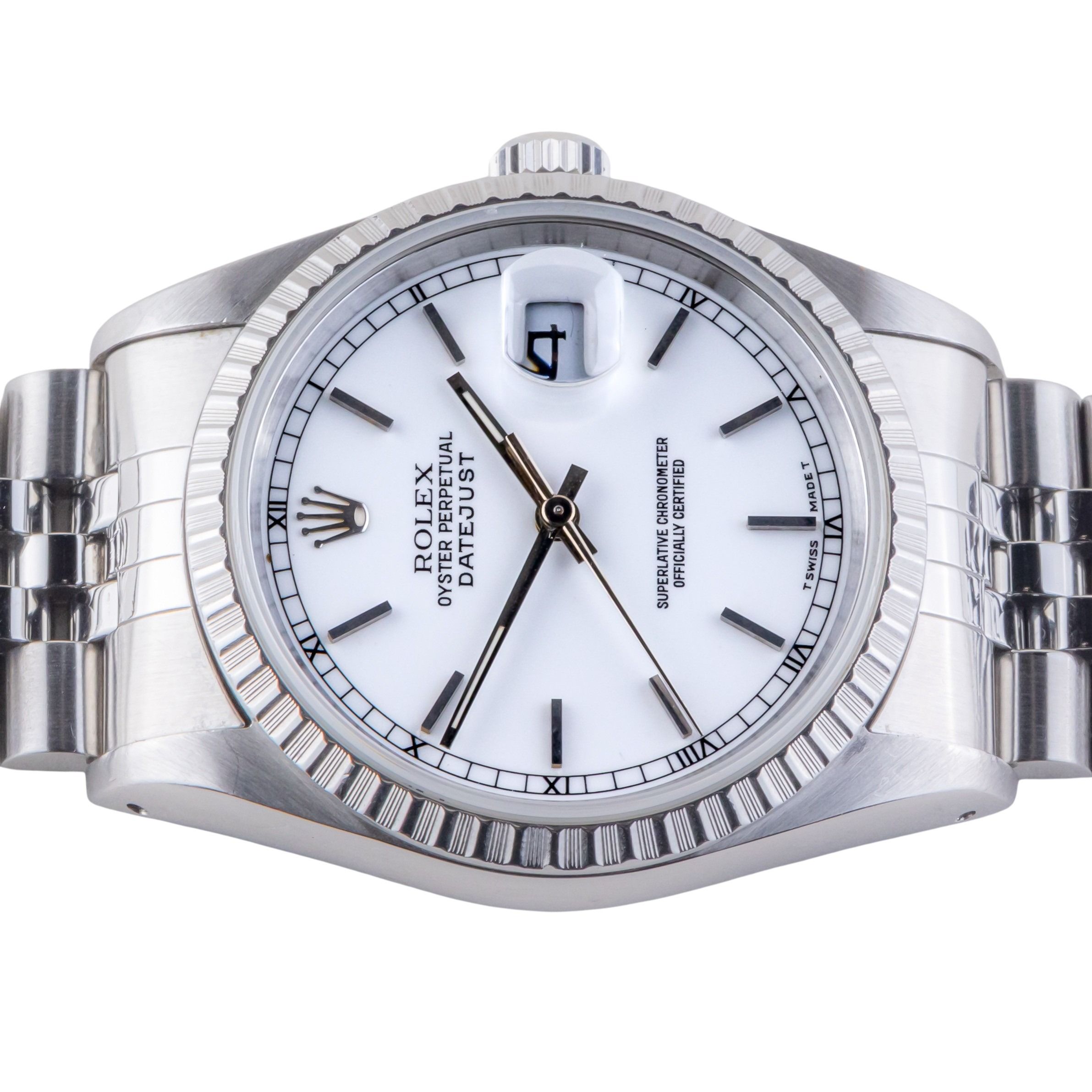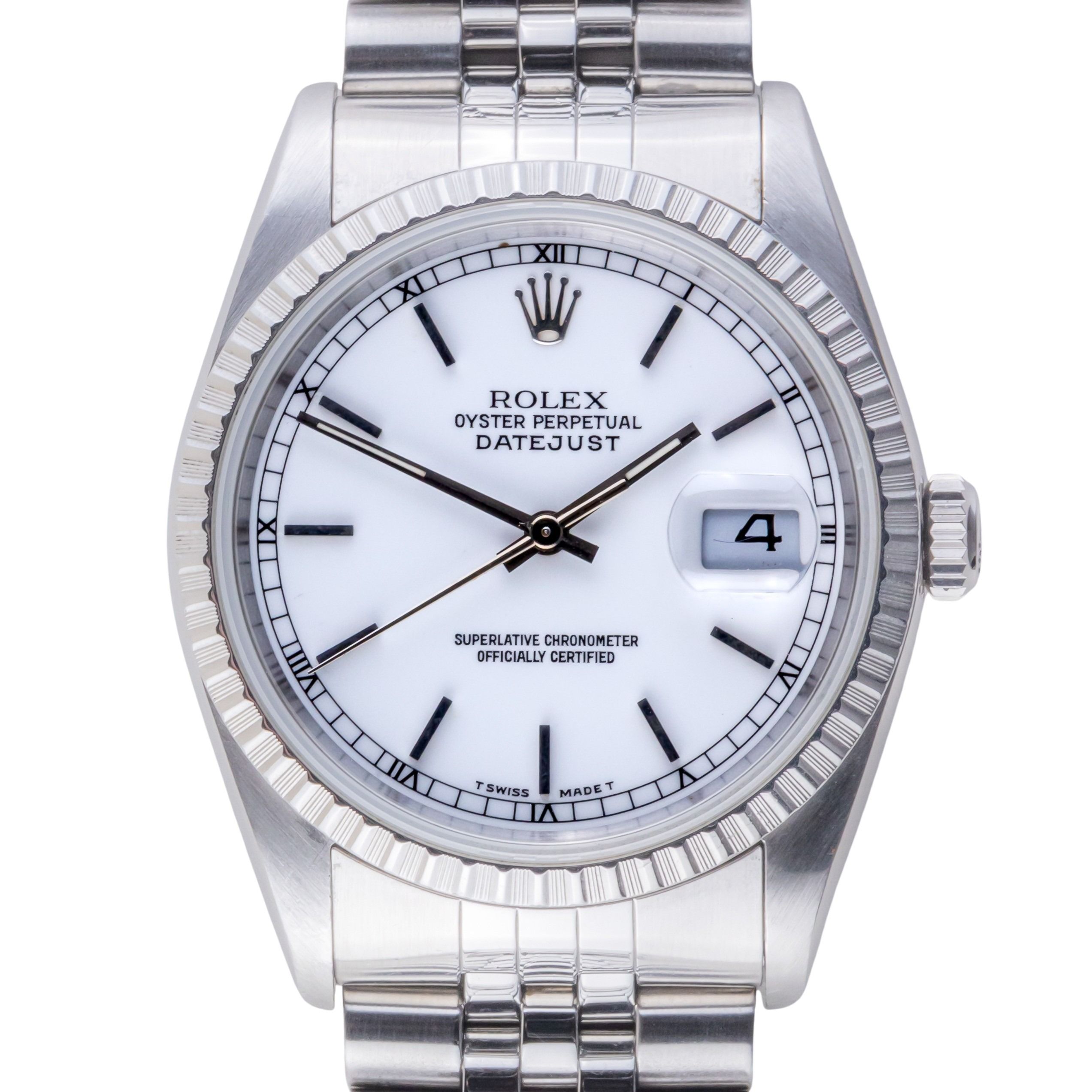 Rolex Oyster Perpetual Datejust reference 16220 from 1991 including box. The Datejust 16220 measures a 36mm stainless steel case, stainless steel Jubilee bracelet and engine turned bezel. The 16220 features an automatic movement caliber 3135 quickset date function, water resistance sapphire crystal and white colored dial with tritium hands.