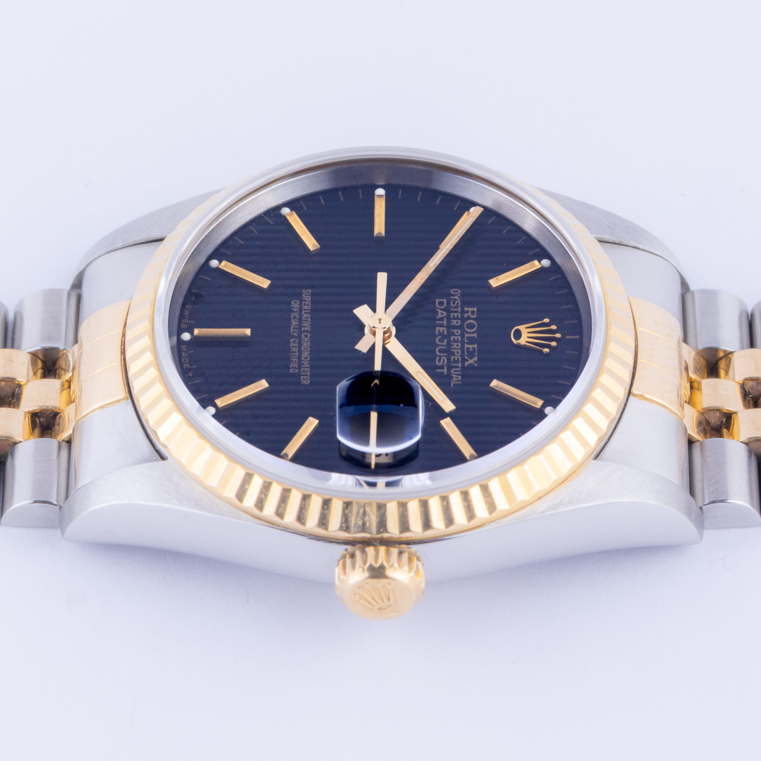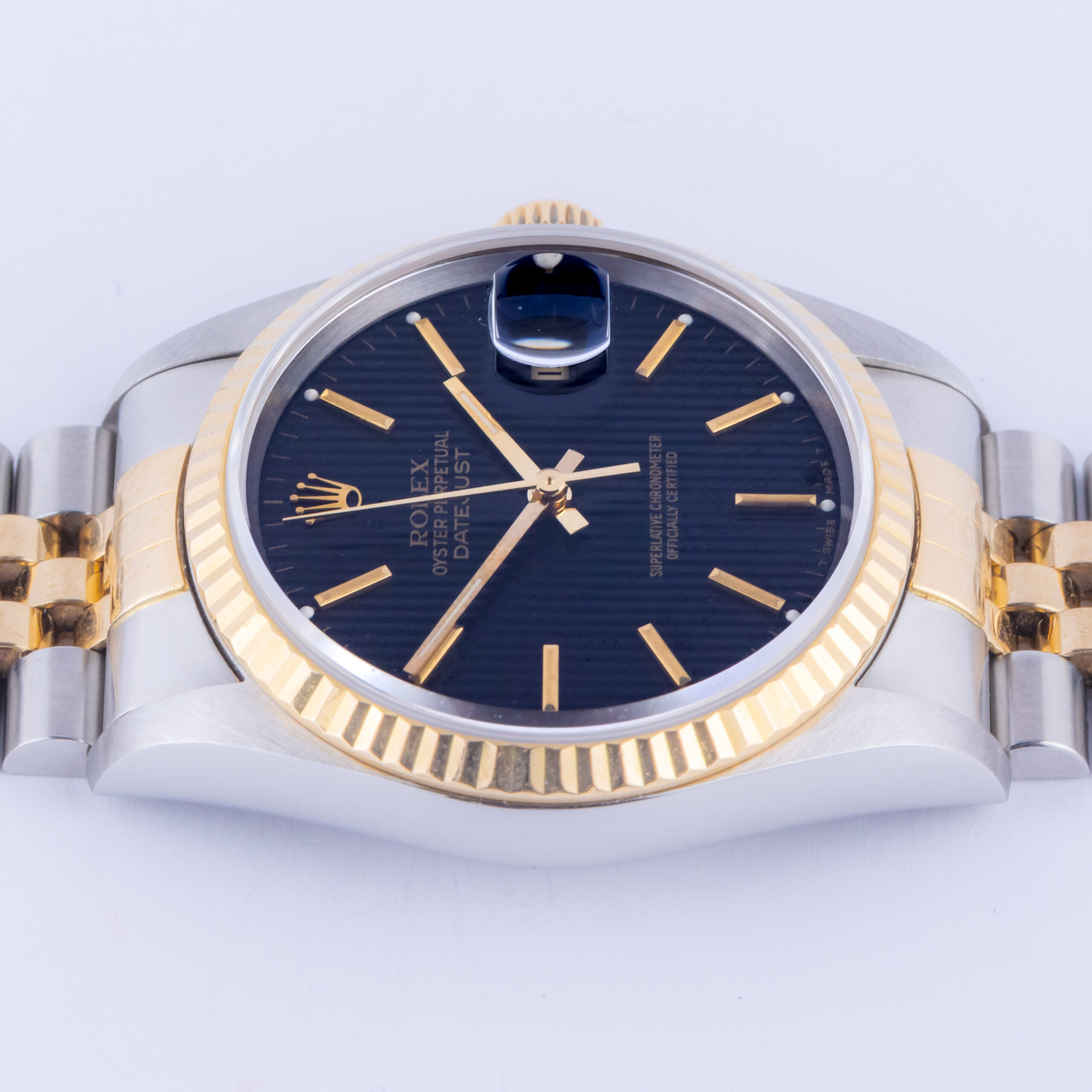 From the 18k gold fluted bezel, the 3-hour Cyclops eye date magnifier to the expertly designed combination of stainless steel and yellow gold (18k), the Rolex Datejust 16233 is the true epitome of iconic Rolex watches. This model first appeared in luxury jewelers in 1988 and packed the punch of powerful upgrades which come with a new reference number “16233”. Rolex replaced the go-to acrylic crystal for the first time and fitted the Datejust with a sapphire crystal instead, which makes it appear a bit more modern.