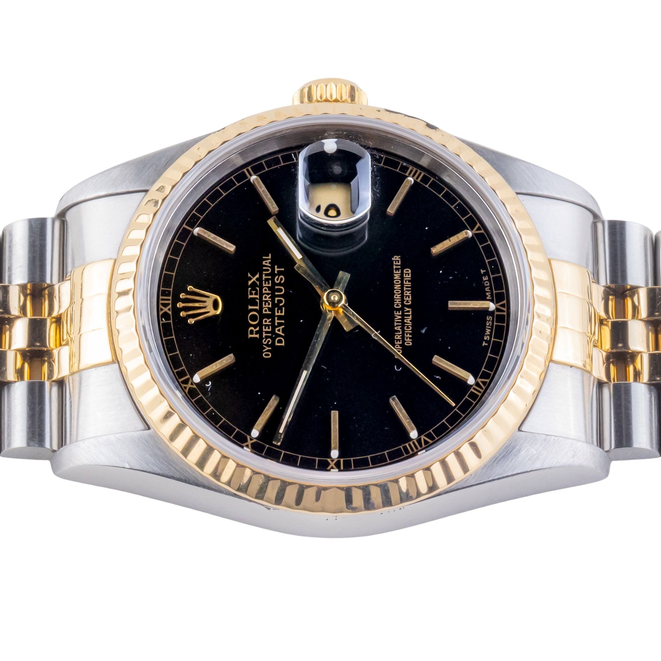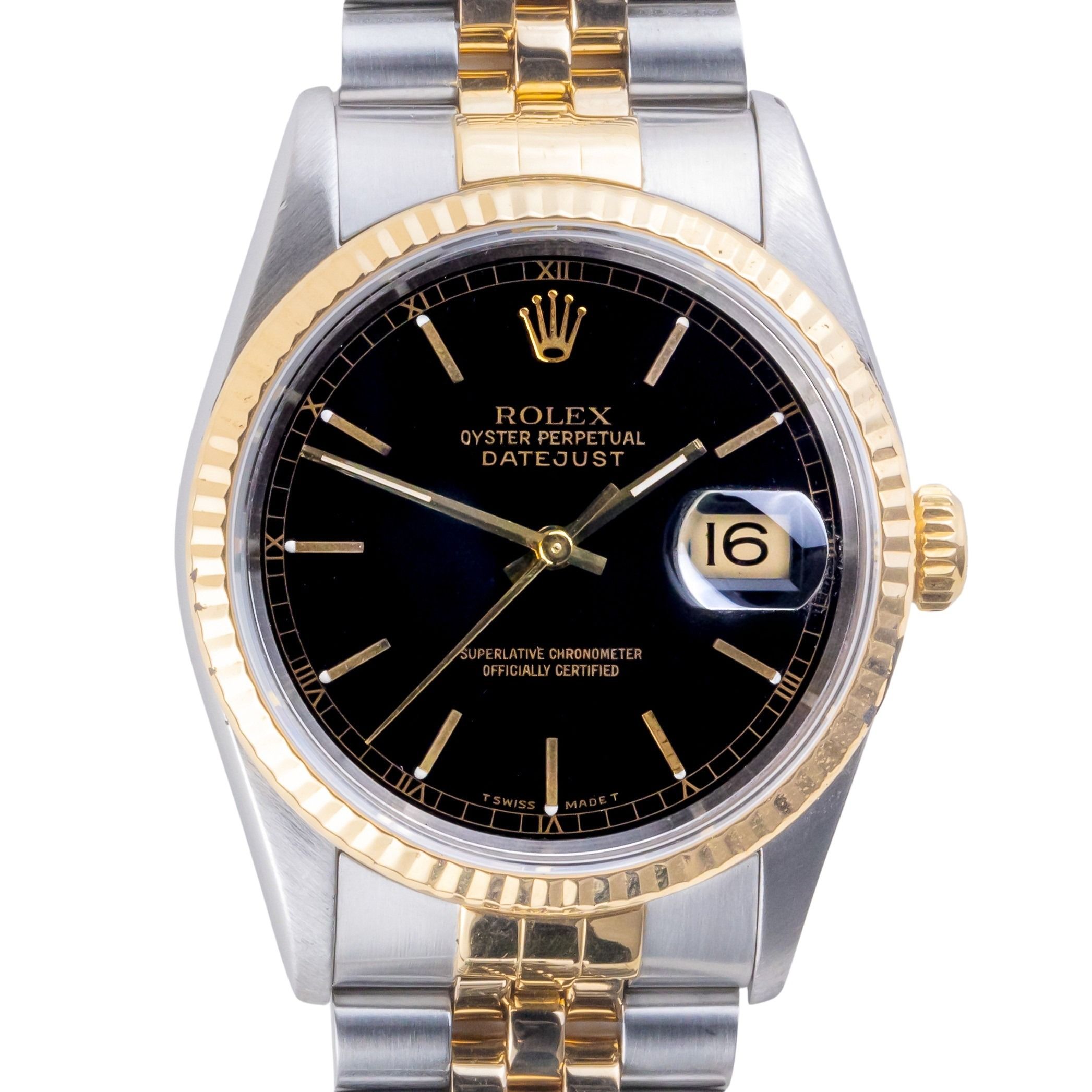 Rolex Oyster Perpetual Datejust reference 16233 from 1995 including full set. The Datejust 16233 measures a 36mm gold and stainless steel case, two-tone Jubilee bracelet and fluted 18k gold bezel. This Datejust 16233 features an automatic movement caliber 3135 with a quickset date function, a scratch resistance sapphire crystal and a black dial with tritium hands.