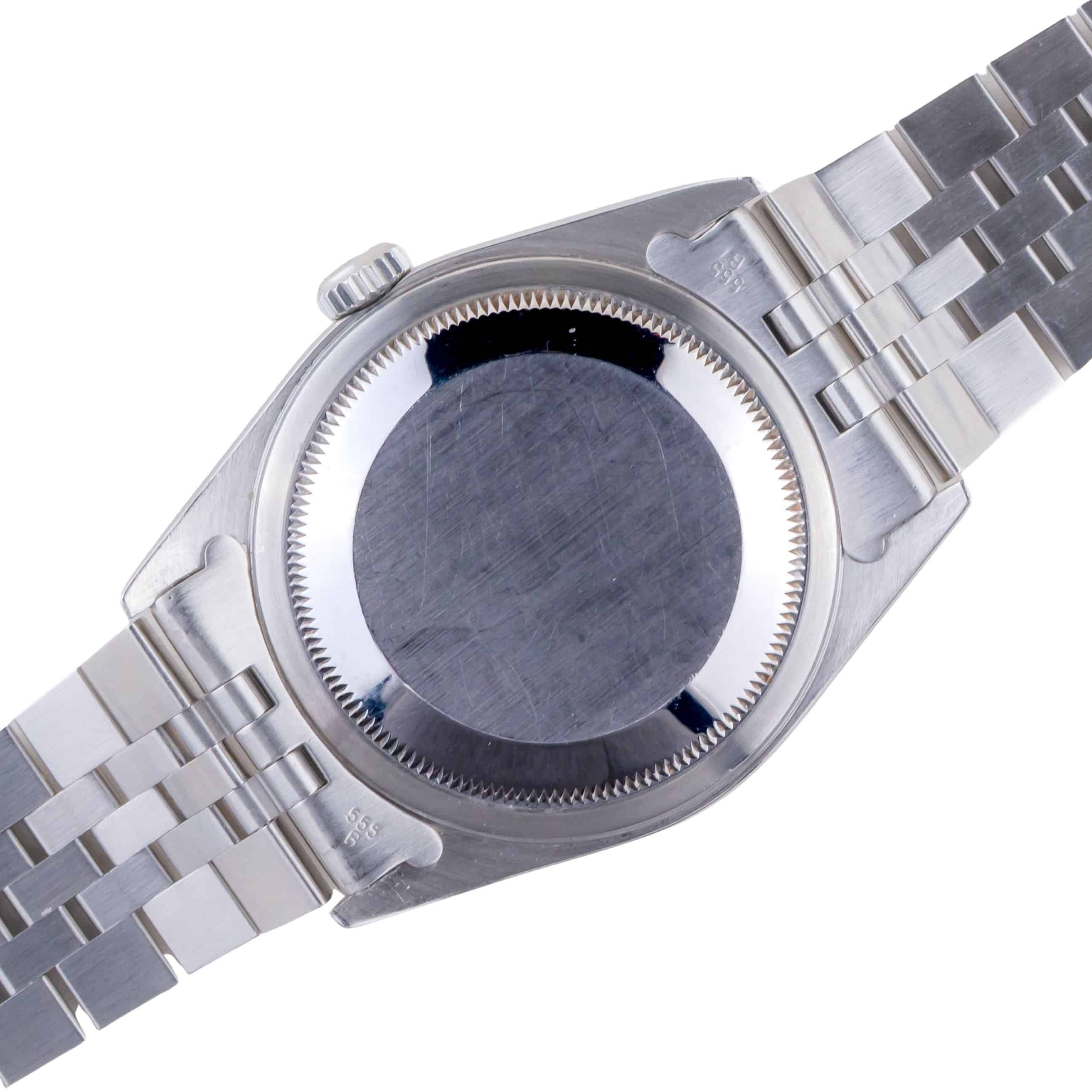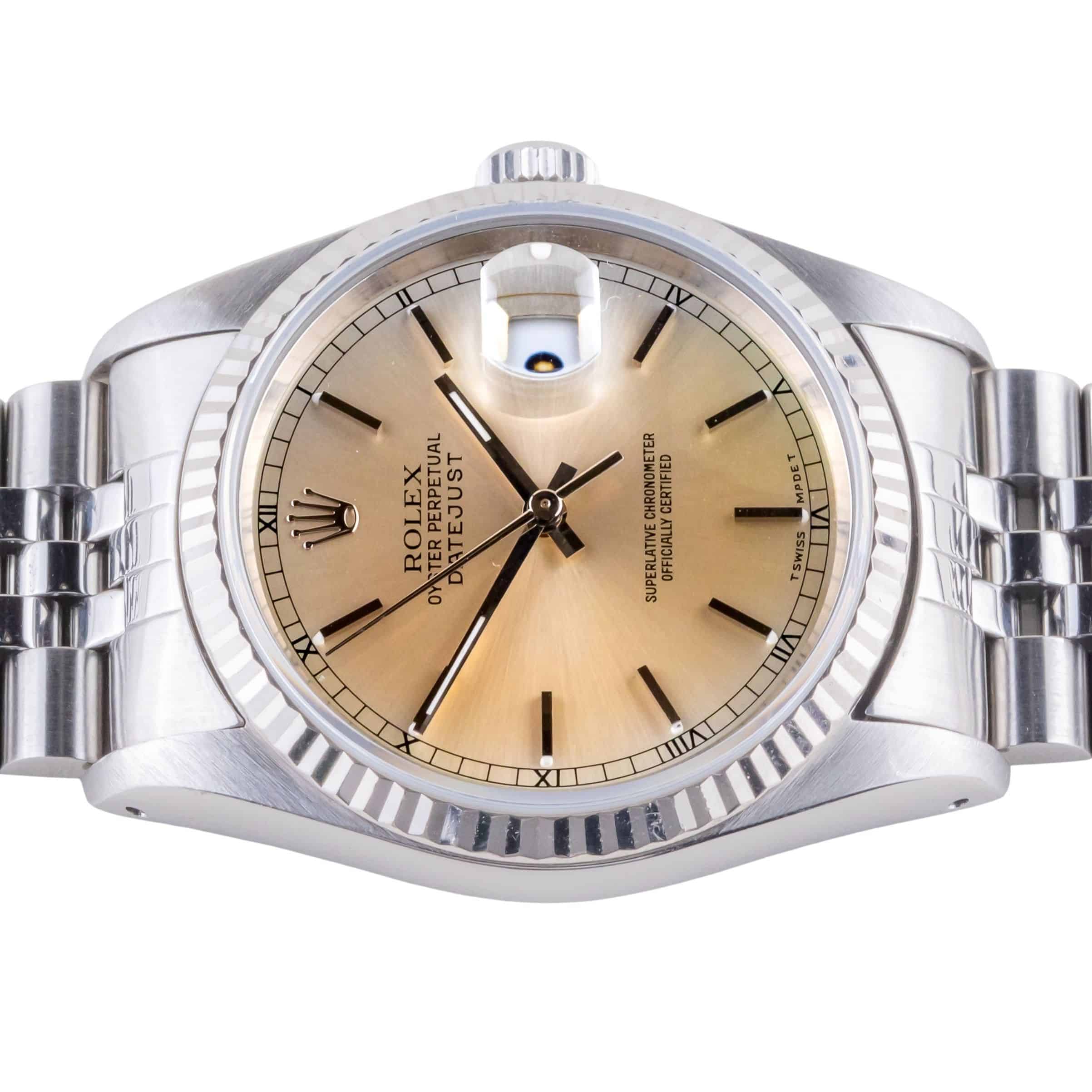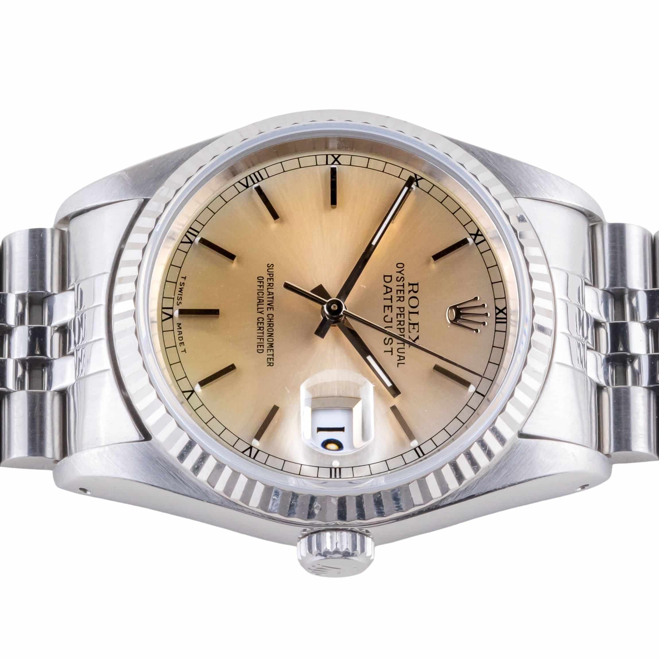 Rolex Oyster Perpetual Datejust reference 16234 from 1991. The Datejust 16234 Datejust measures a 36mm stainless steel case, a stainless steel Jubilee bracelet and a fluted 18k white gold bezel. This Datejust 16234 features an automatic movement caliber 3135 with quickset date function, a scratch resistance sapphire crystal and a silver dial.