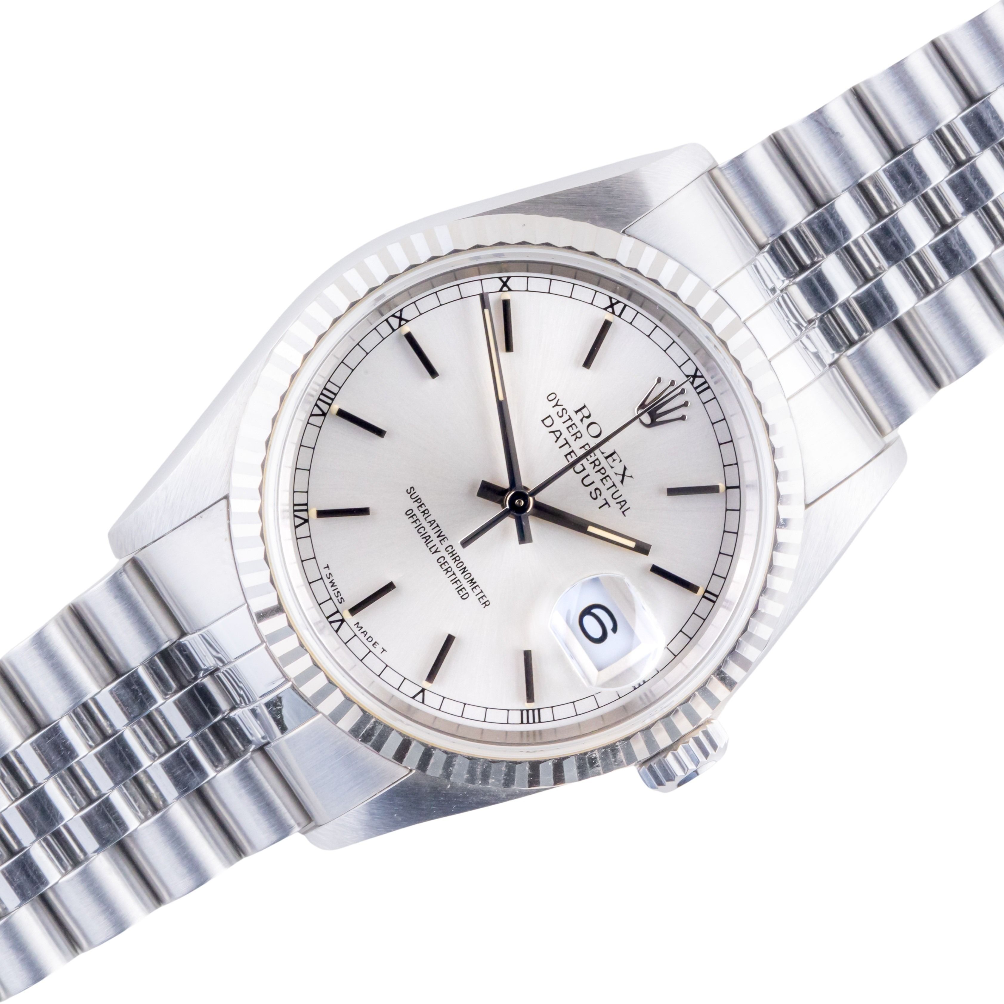 Rolex Oyster Perpetual Datejust reference 16234 from 1993. The Datejust 16234 Datejust measures a 36mm stainless steel case, a stainless steel Jubilee bracelet and a fluted 18k white gold bezel. This Datejust 16234 features an automatic movement caliber 3135 with quickset date function, a scratch resistance sapphire crystal and a silver dial.Every pre-owned watch we sell, comes with a 12-month warranty from the date of purchase. Every watch sold by Langedyk Vintage Watches is included with a LVW watch box, Authenticity report and free worldwide (insured) shipment.If you have any inquiries or would like to receive additional information about this watch, please feel free to contact us by phone or email. We will respond to your request as soon as possible.Please also have a look at our full collection of Rolex Datejust watches.