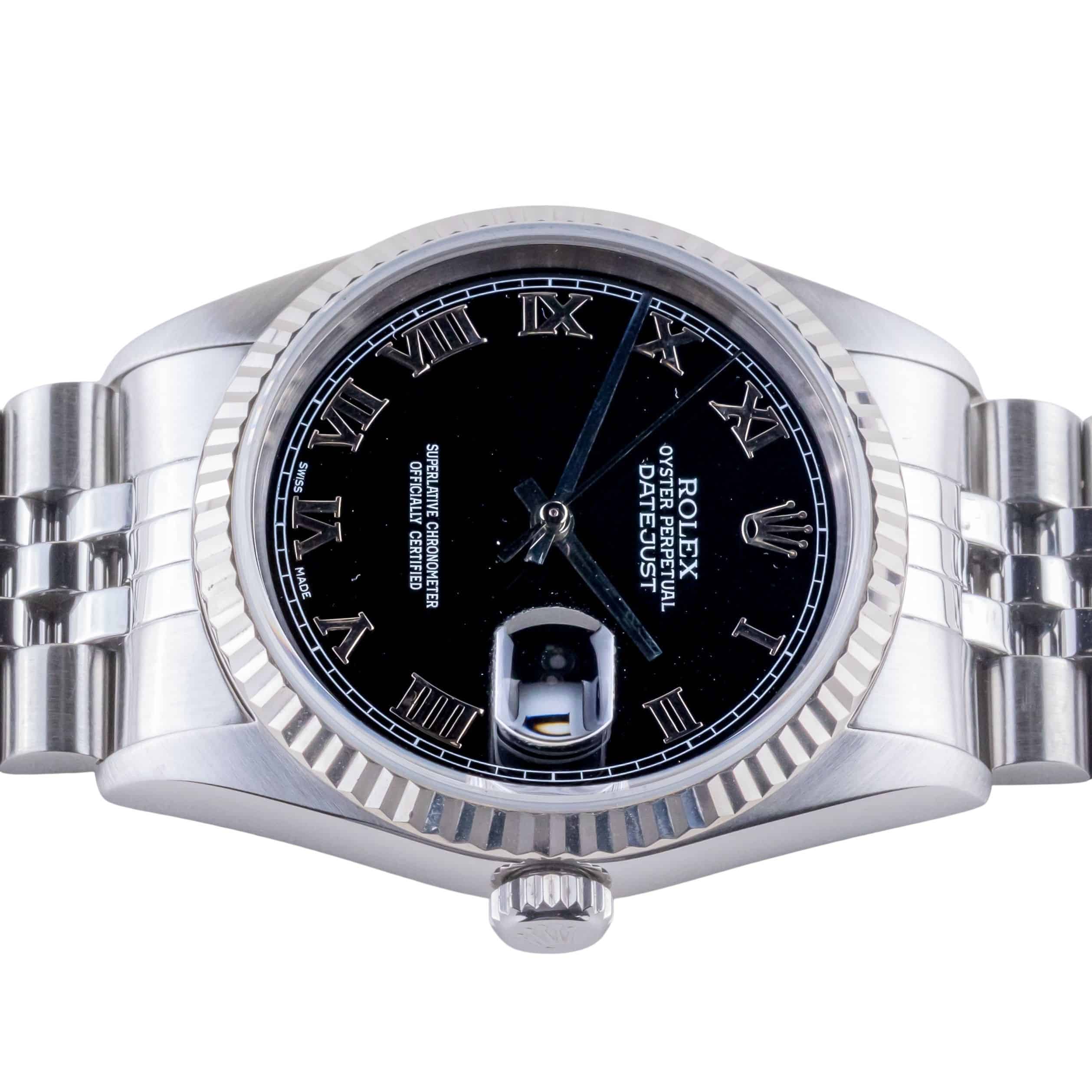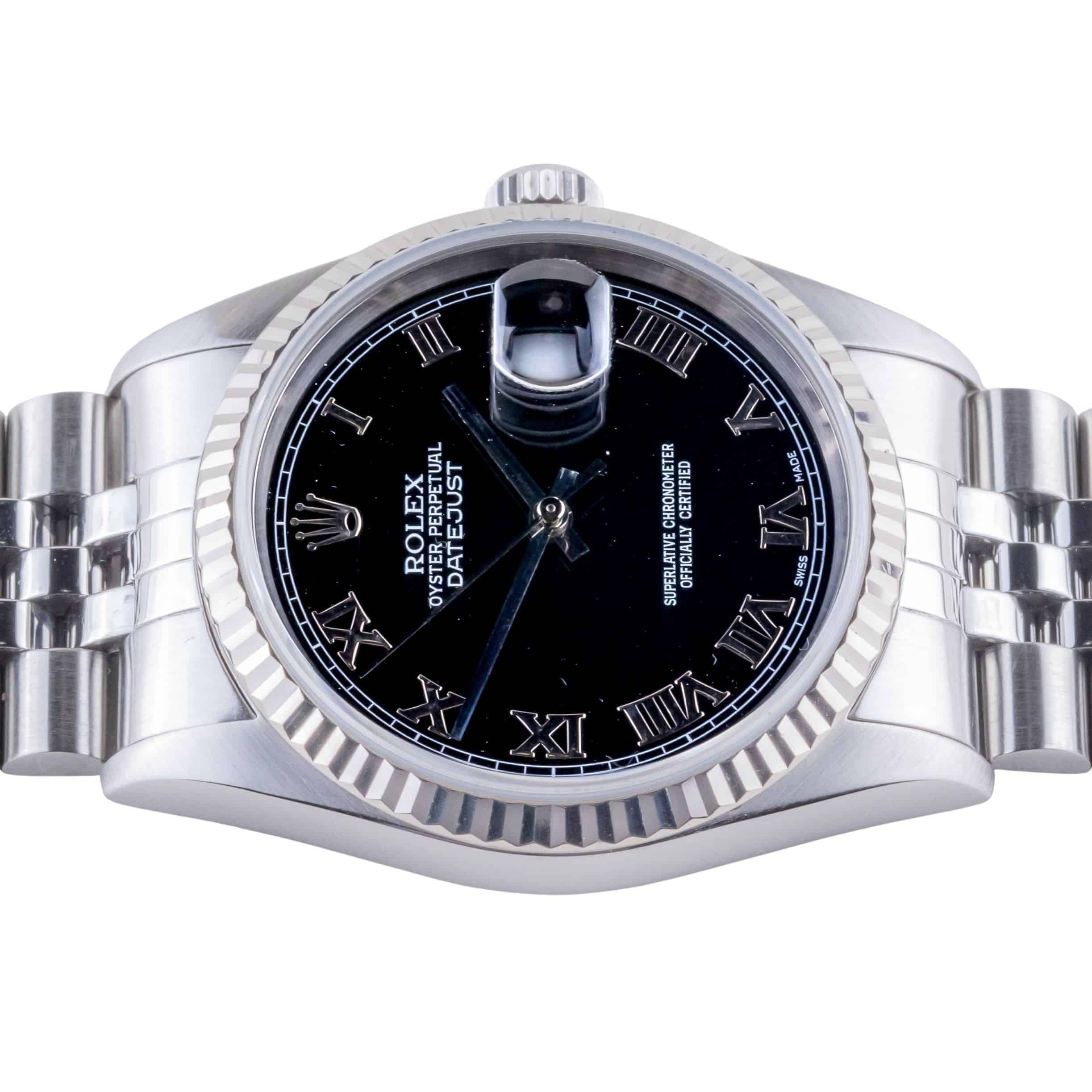 Rolex Oyster Perpetual Datejust reference 16234 from 1997 including full set. The Datejust 16234 Datejust measures a 36mm stainless steel case, a stainless steel Jubilee bracelet and a fluted 18k white gold bezel. This Datejust 16234 features an automatic movement caliber 3135 with quickset date function, a scratch resistance sapphire crystal and a black stick dial with Roman markers.