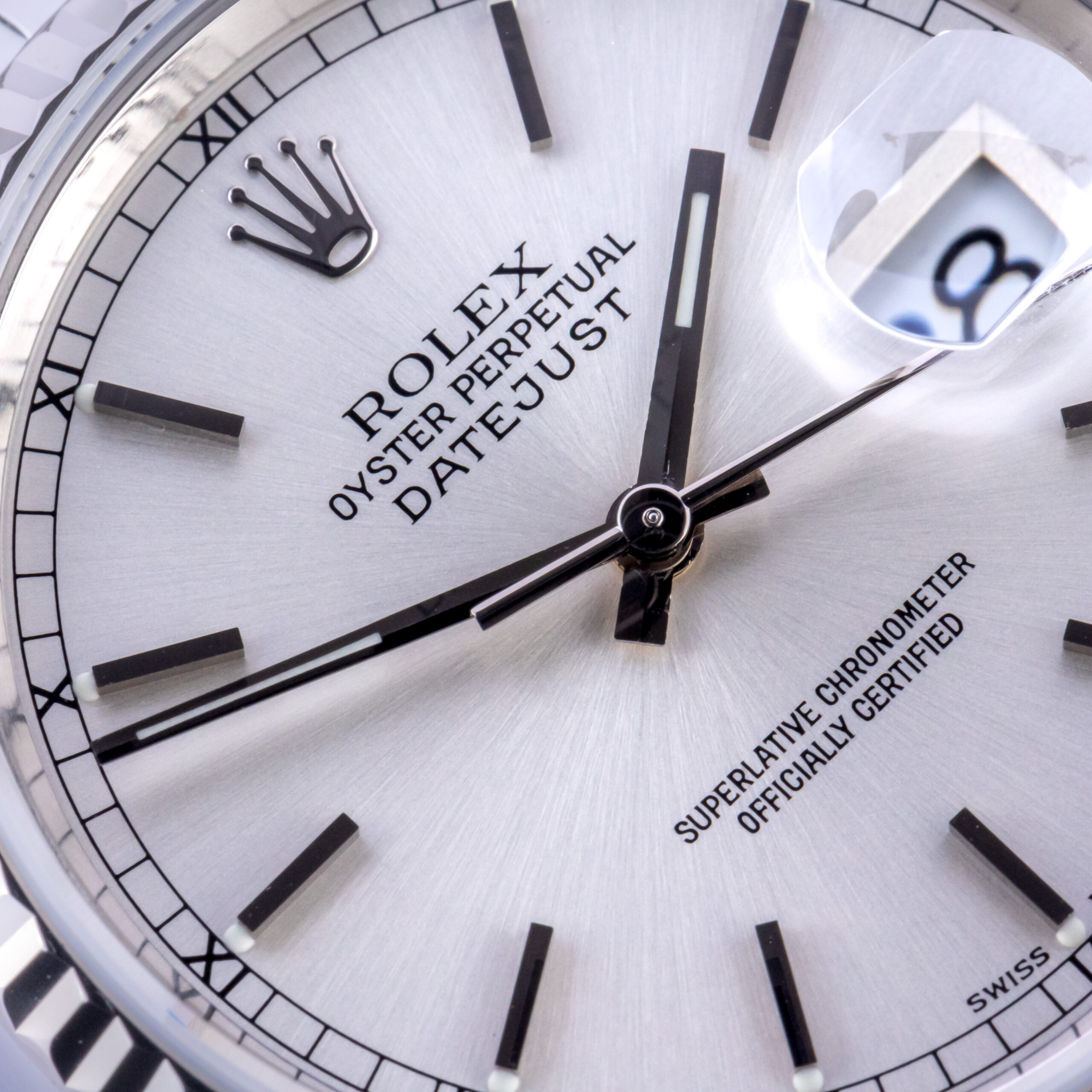 Rolex Oyster Perpetual Datejust reference 16234 from 2001 The Datejust 16234 Datejust measures a 36mm stainless steel case, a stainless steel Jubilee bracelet and a fluted 18k white gold bezel. This Datejust 16234 features an automatic movement caliber 3135 with quickset date function, a scratch resistance sapphire crystal and a silver dial.