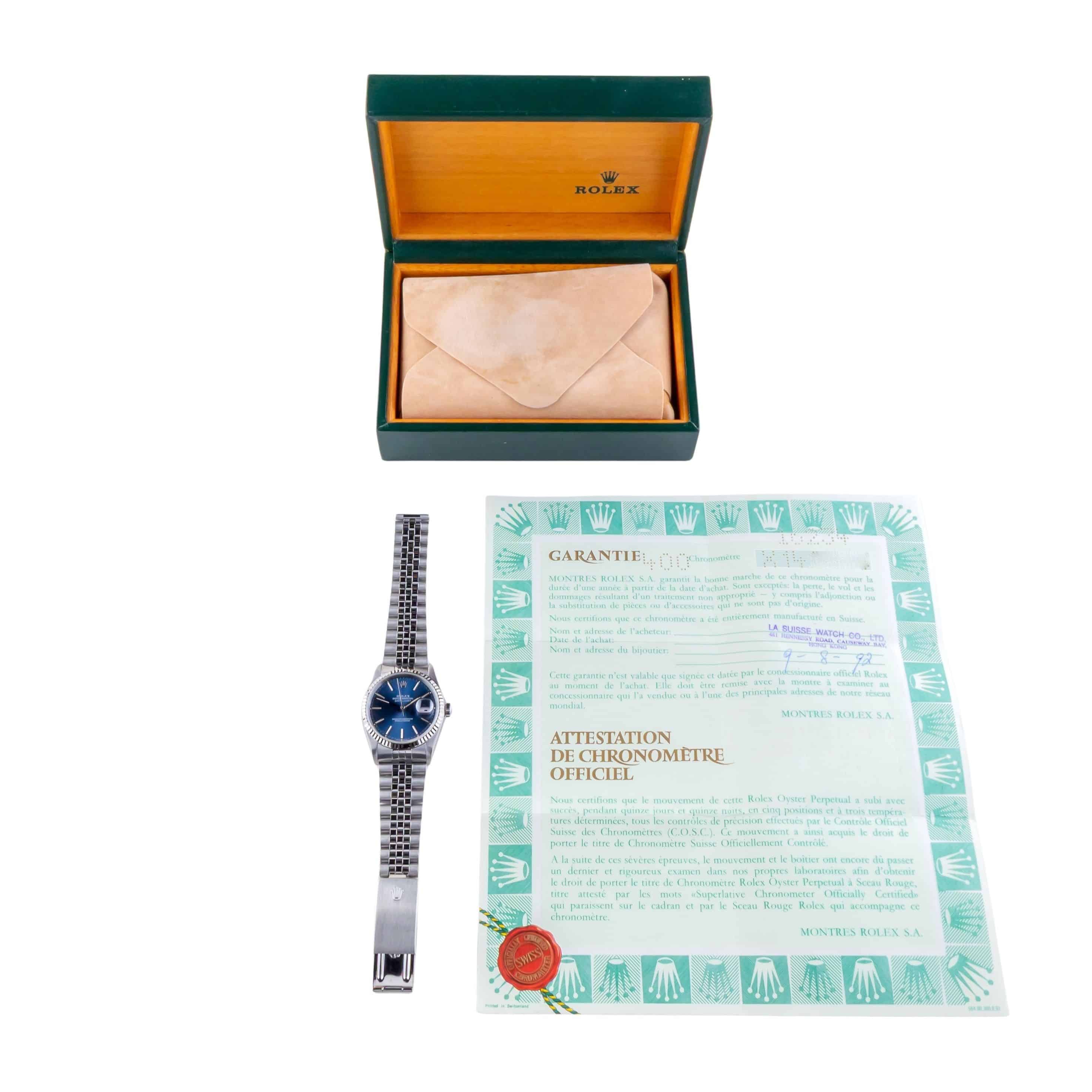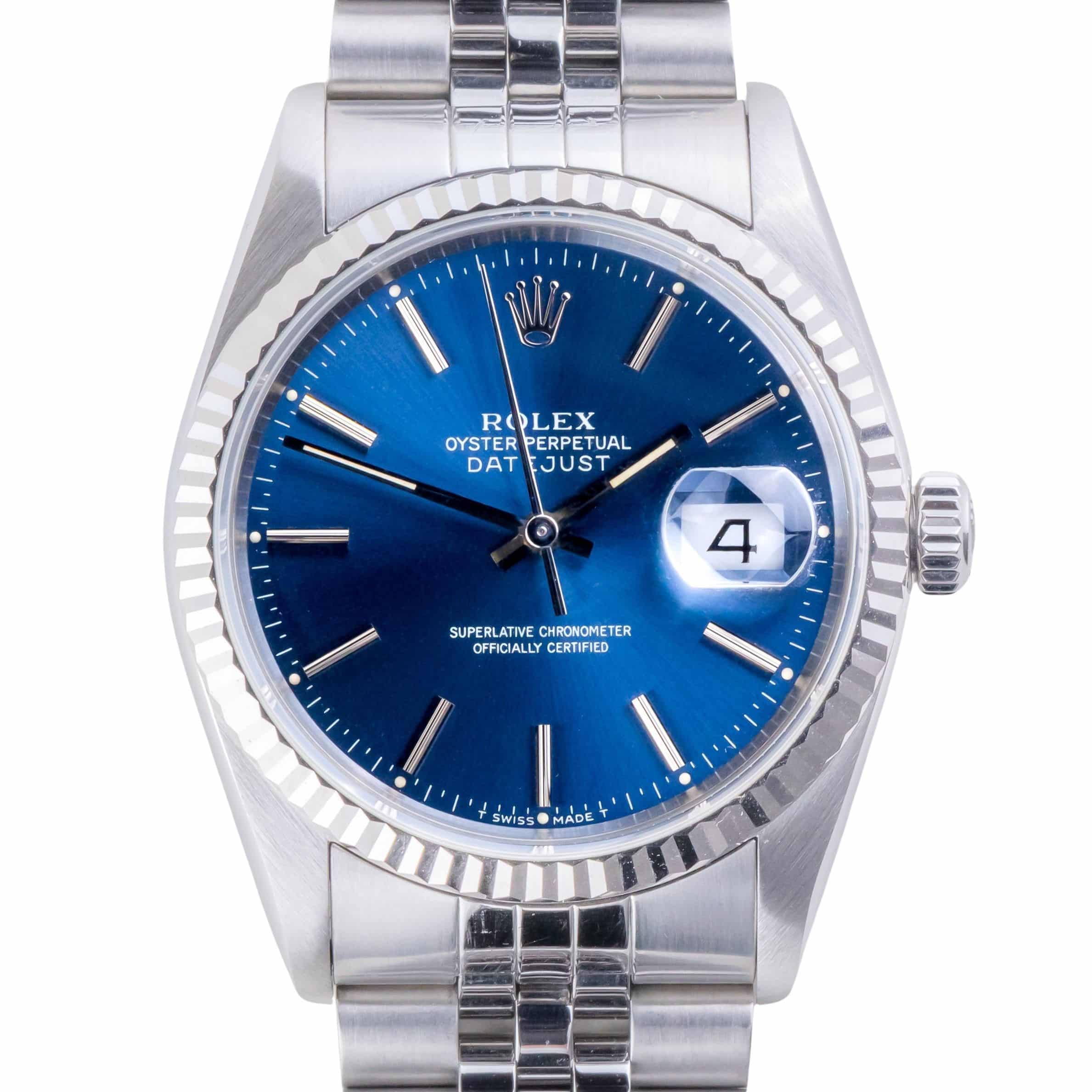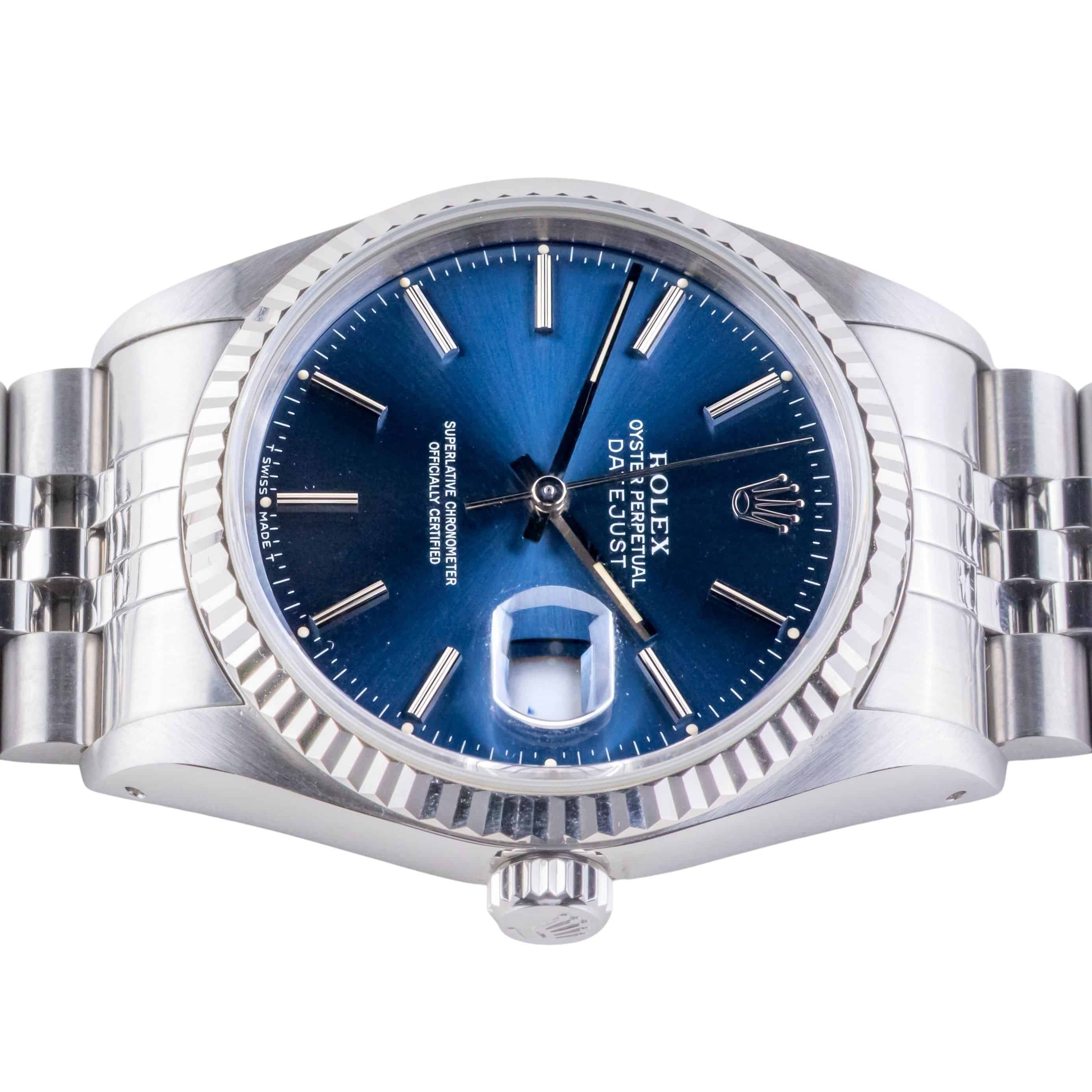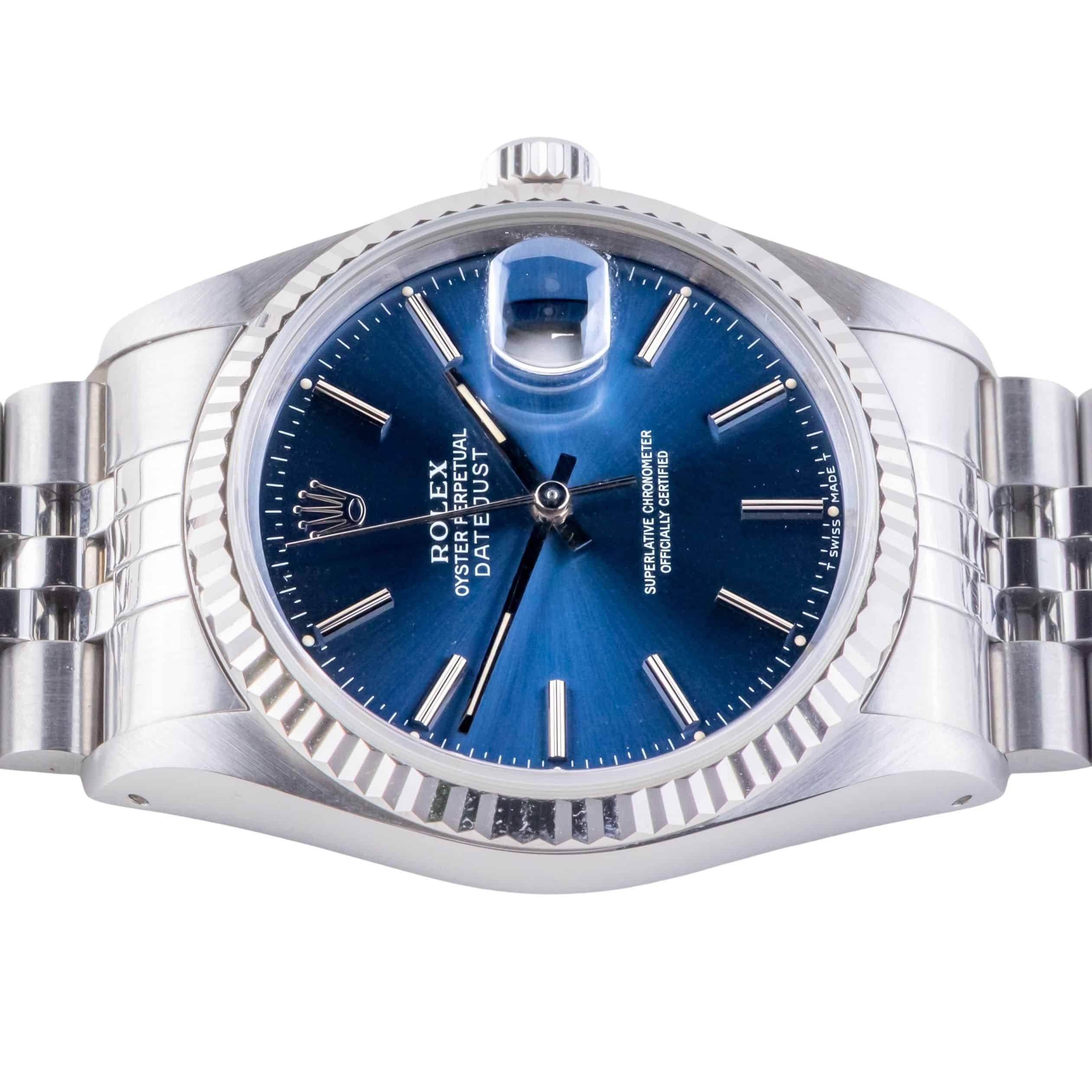 Rolex Oyster Perpetual Datejust reference 16234 from 1991 including full set. The Datejust 16234 Datejust measures a 36mm stainless steel case, a stainless steel Jubilee bracelet and a fluted 18k white gold bezel. This Datejust 16234 features an automatic movement caliber 3135 with quickset date function, a scratch resistance sapphire crystal and a blue stick dial with roman minute track.