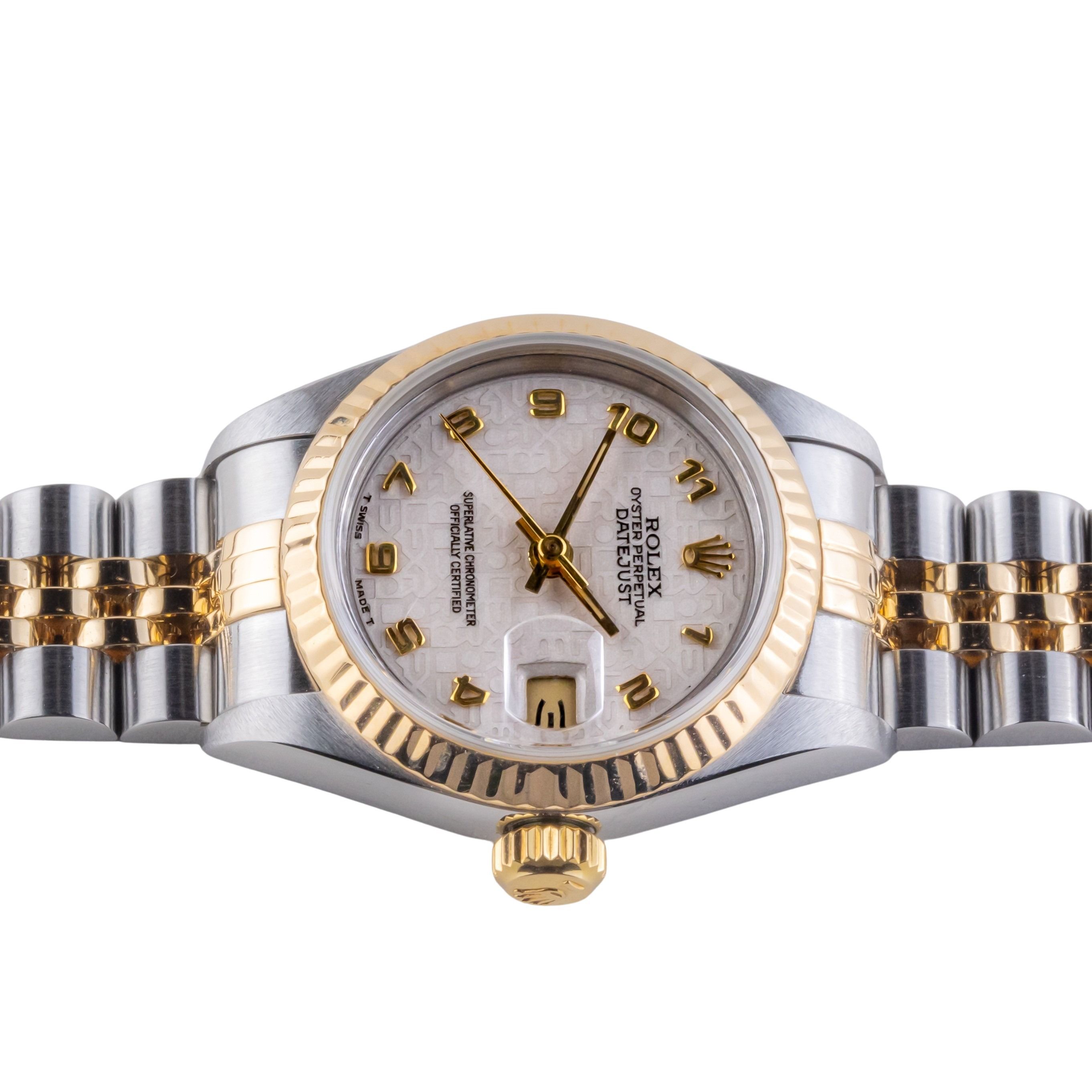 Rolex Oyster Perpetual Lady-Datejust reference 69173 from 1996 including full set. The Lady-Datejust 69173 measures a 26mm gold and stainless steel case, two-tone jubilee bracelet and fluted 14k yellow gold bezel. This Lady-Datejust 69173 features an automatic movement caliber 2135 with quickset date function, a scratch resistance sapphire crystal and a Creme logo dial w/ tritium hands.