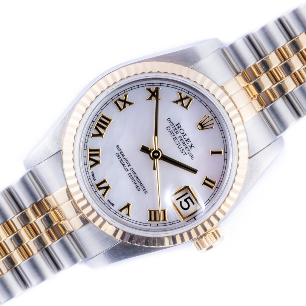 Rolex Oyster Perpetual Datejust Mid-Size reference 68273 from 1995 including full set. The Datejust 68273 measures a 31mm gold/stainless steel case, a gold/stainless steel Jubilee bracelet and a fluted 18k gold bezel. This Datejust 68273 features an automatic movement caliber 3135 with quickset date function, a scratch resistance sapphire crystal and a MOP dial with tritium hands and Roman markers.