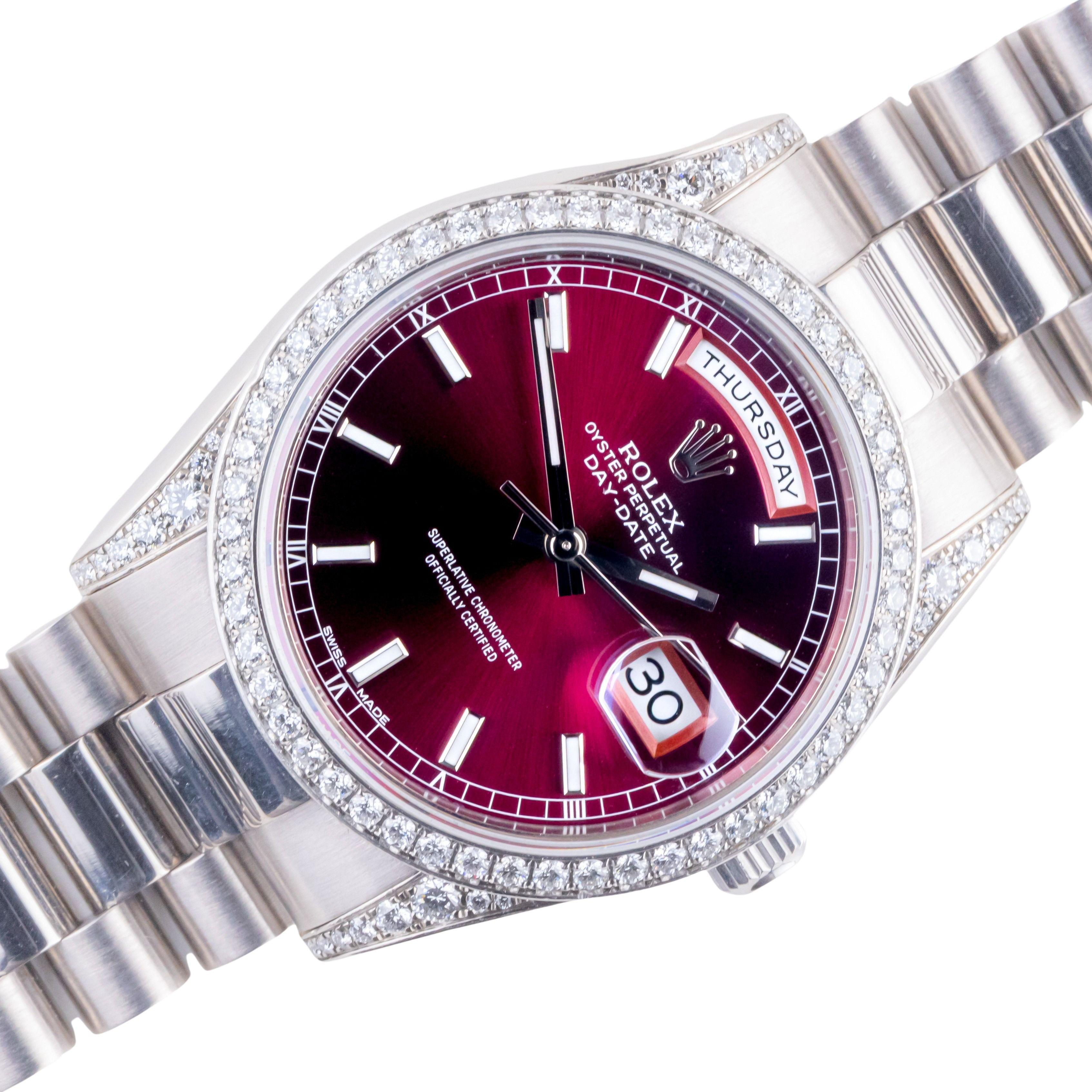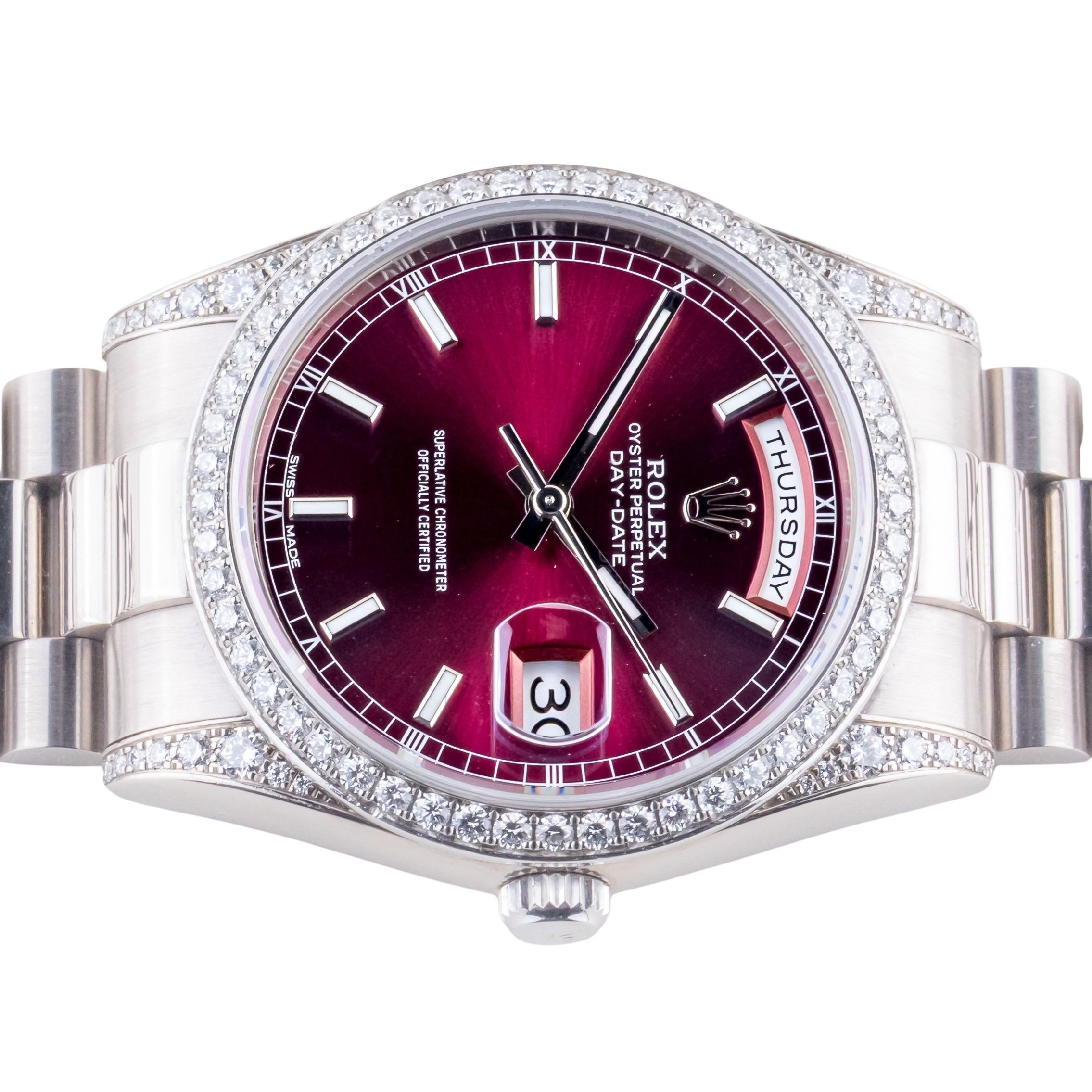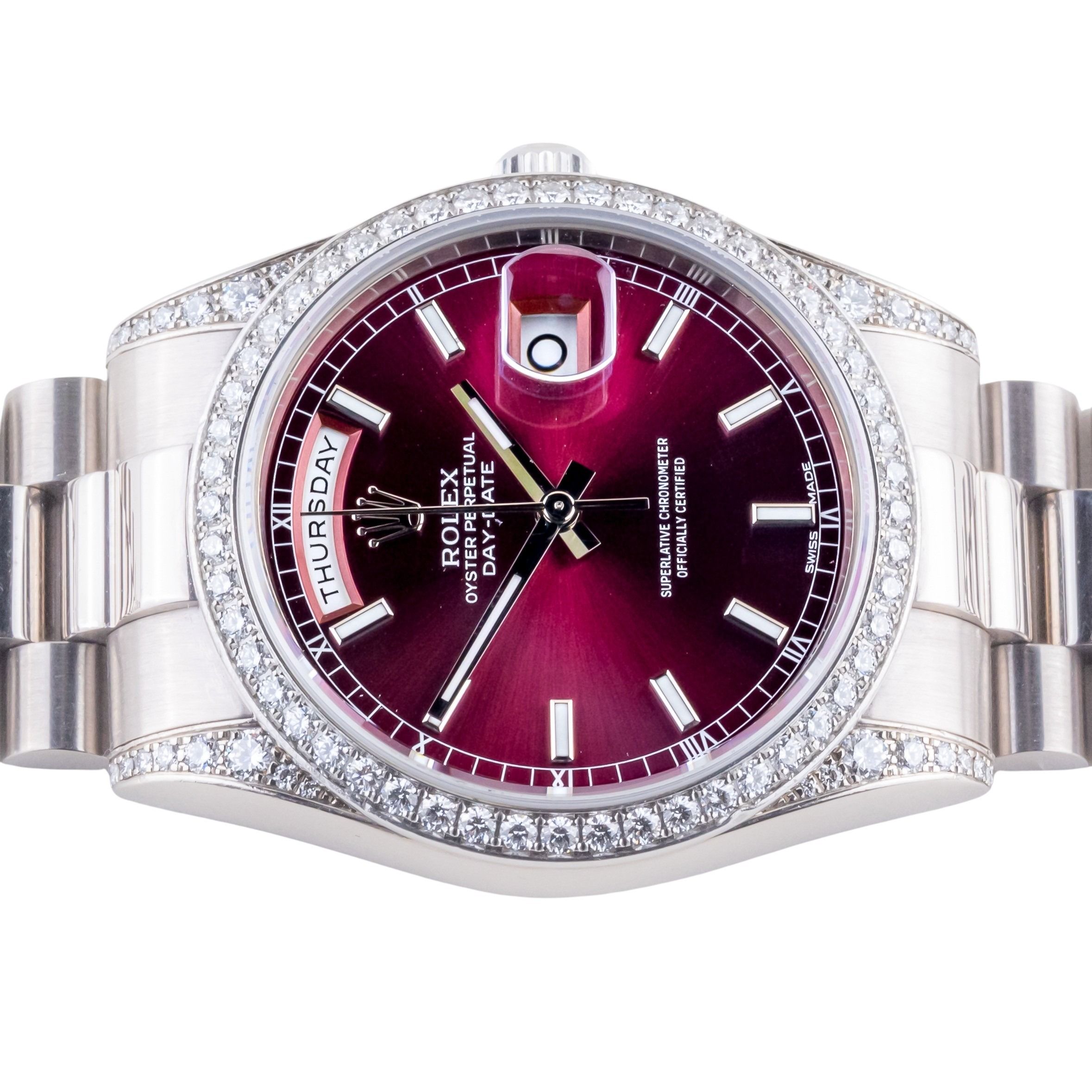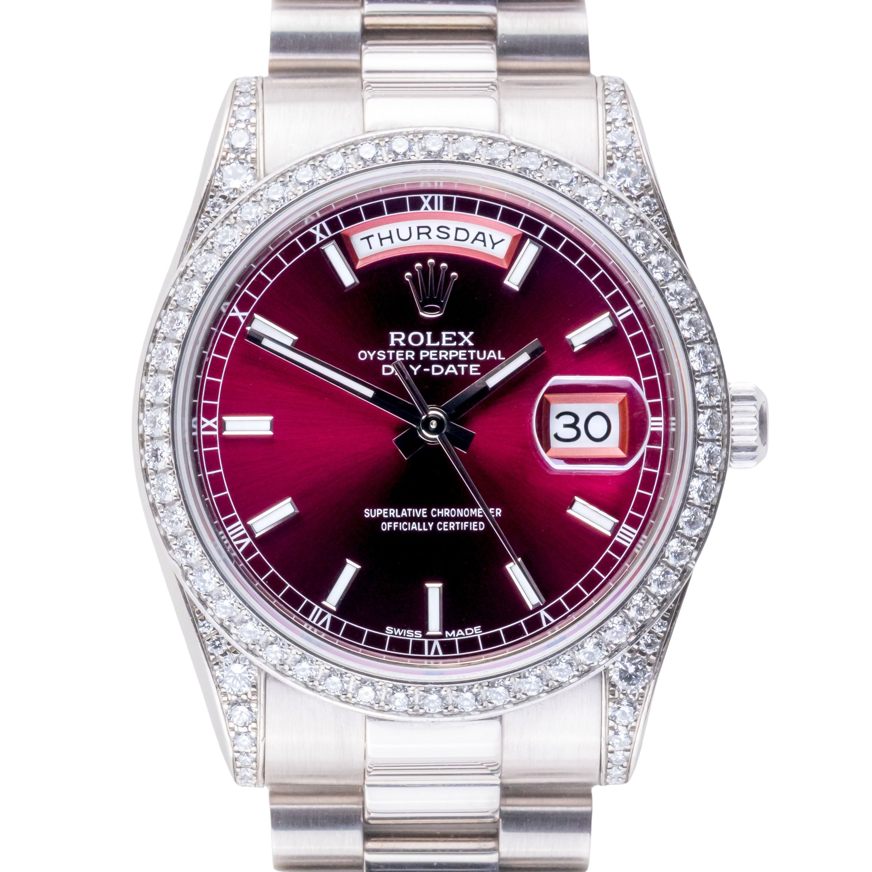 The Day-Date 118389 features a 36mm 18k white gold case with diamond-set lugs, an 18k white gold President bracelet with Crownclasp, and a diamond bezel. Powered by the automatic calibre 3155 movement with a double quickset function for both day and date, it also includes a scratch-resistant sapphire crystal and a cherry dial with Luminova accents.