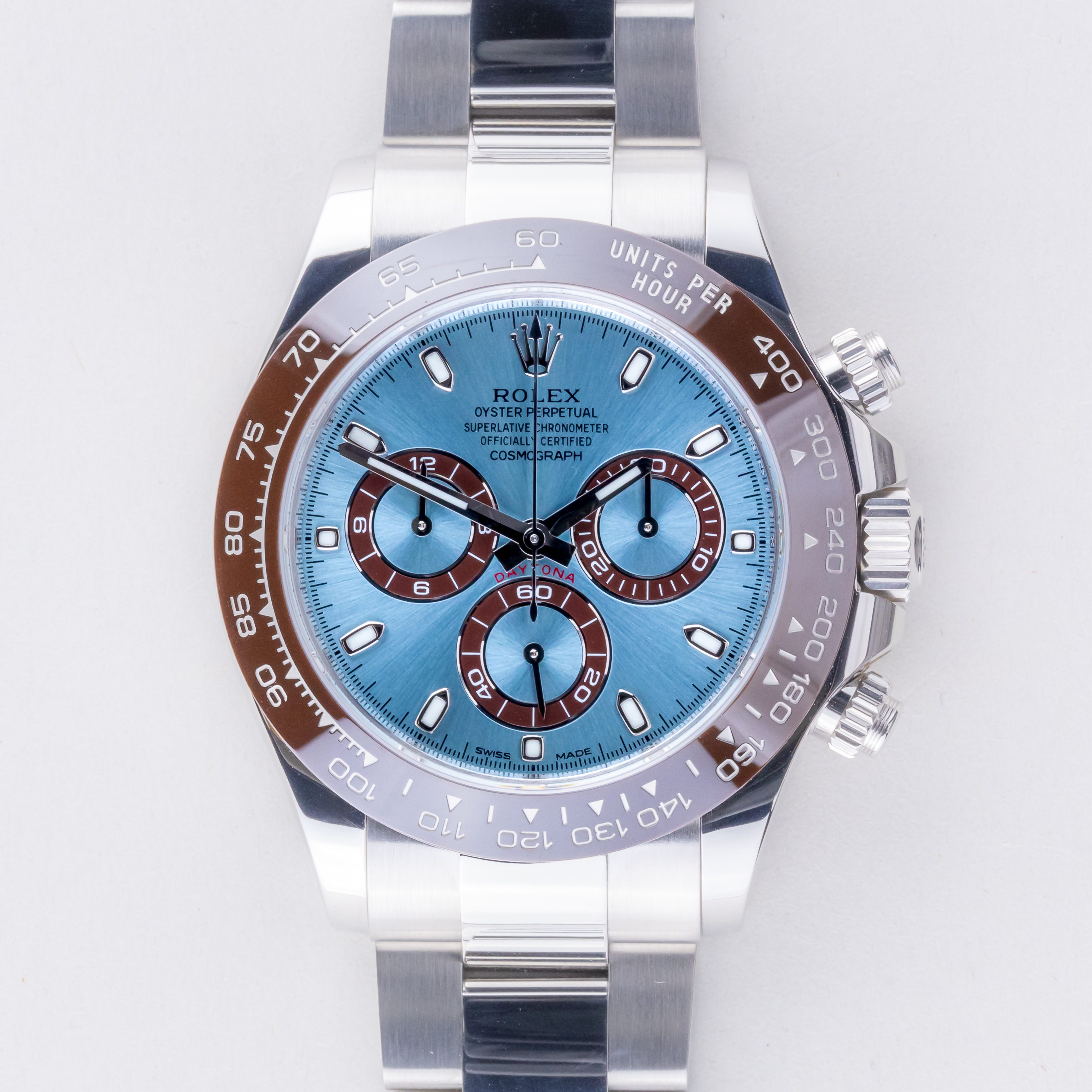 Rolex Daytona reference 116506 from 2021 including full set. The Rolex Daytona reference 116506 measures a 40mm Platinum case and features a platinum Oyster bracelet and a brown bezel. The Rolex Daytona 116506 is powered by an in-house Caliber 4130 movement that features a chronograph function, allowing you to time your activities with accuracy and ease.