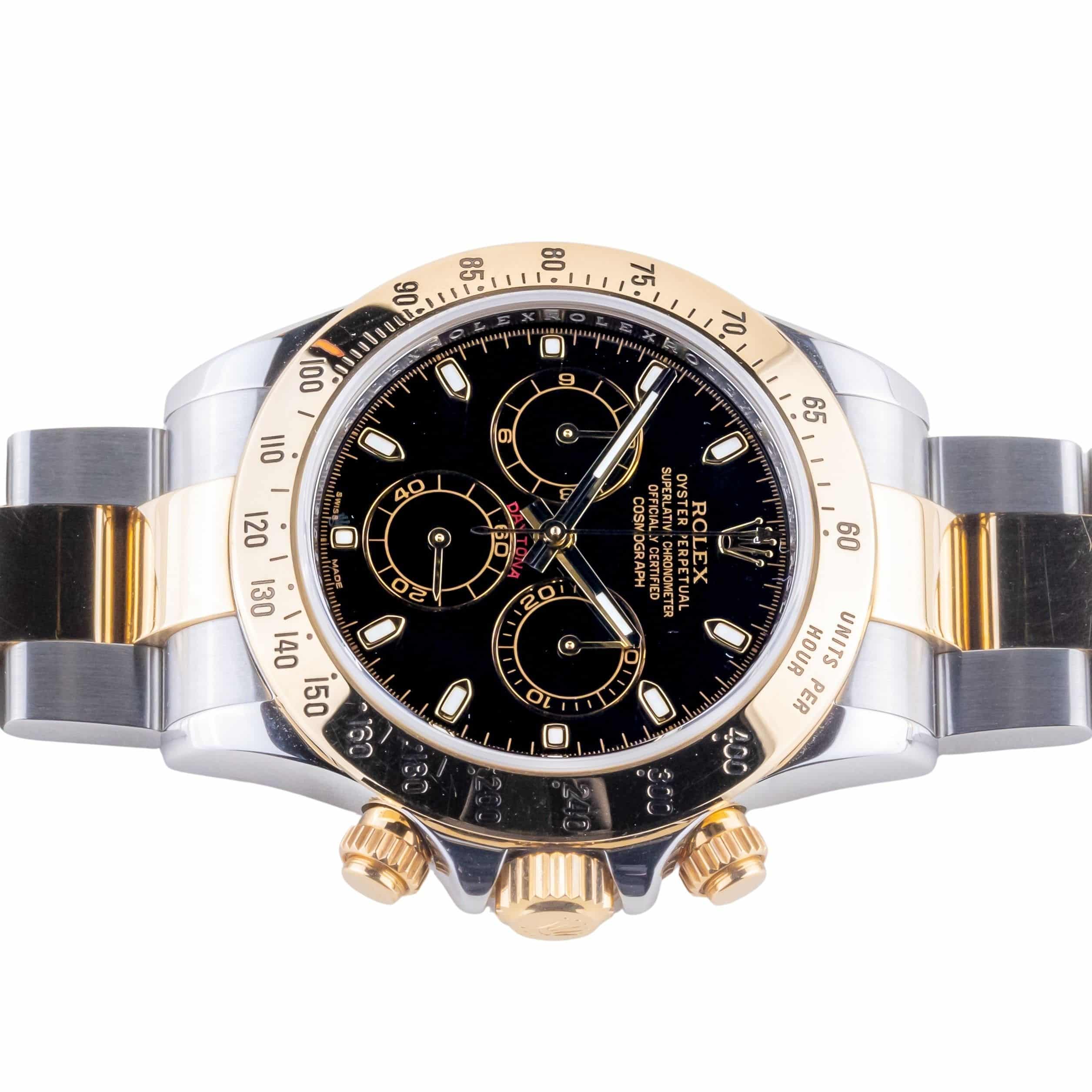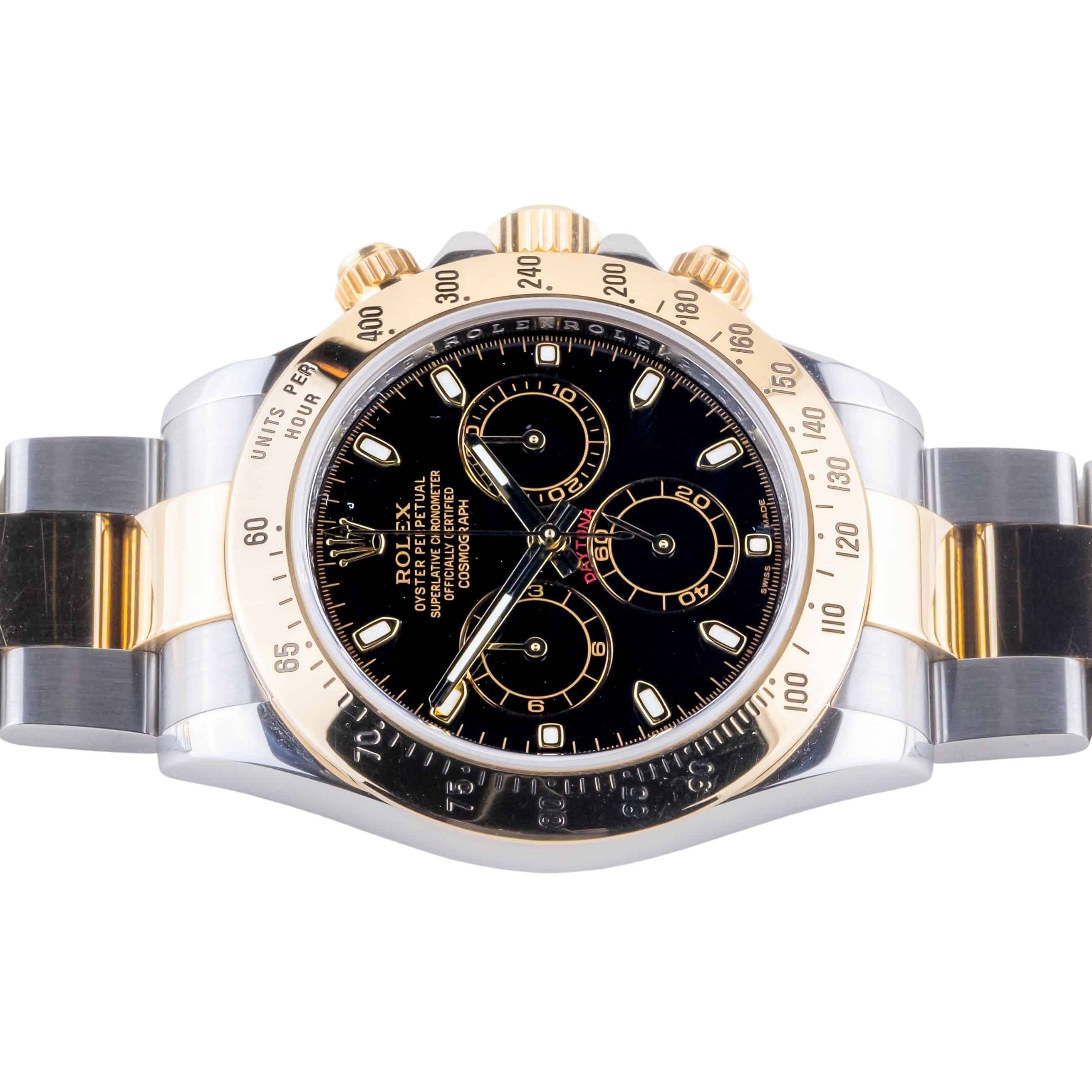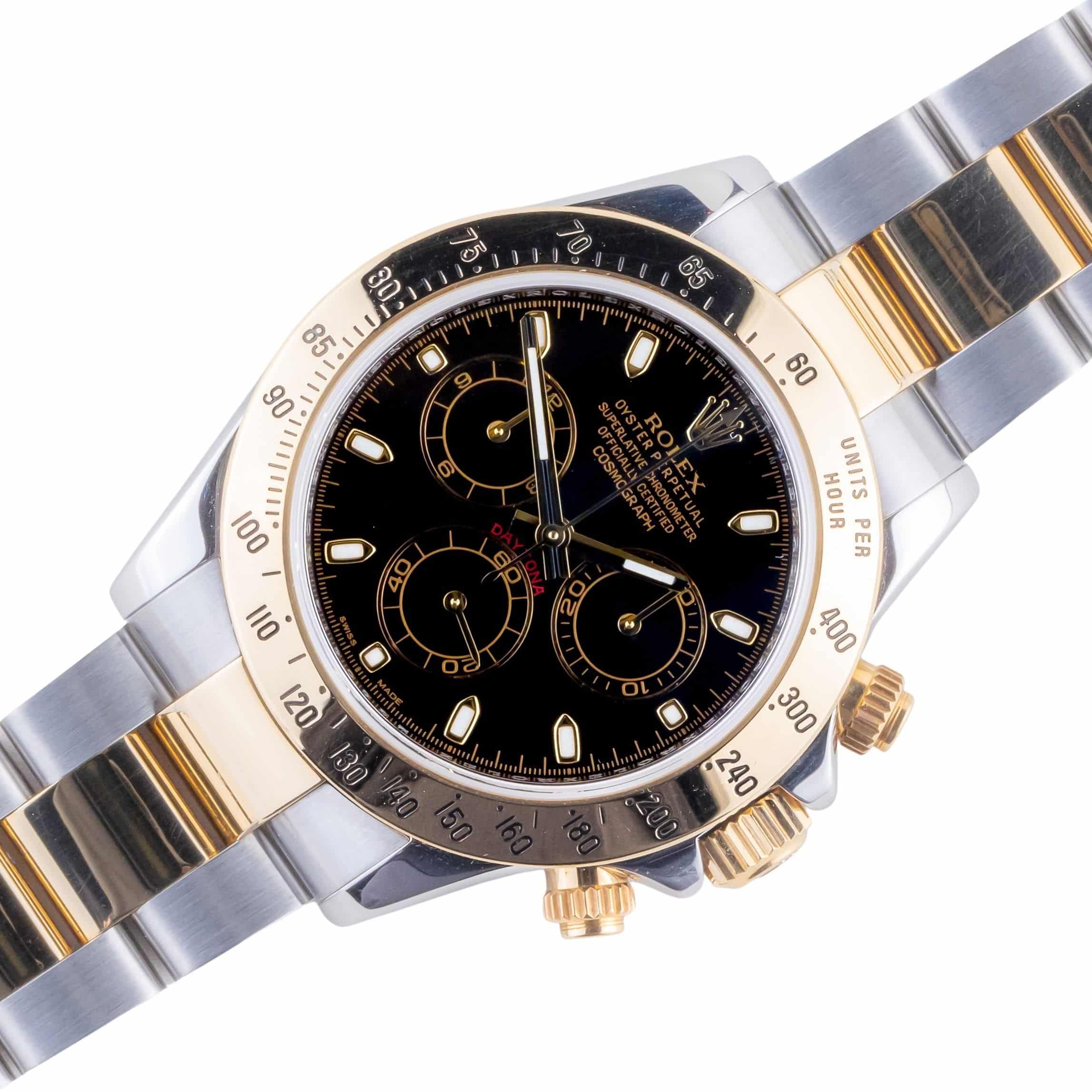 Rolex Daytona reference 116523 from 2008 including full set. The Rolex Daytona reference 116523 measures a 40mm gold/stainless steel case, features a gold/stainless steel Oyster bracelet and 18k yellow gold bezel. The Rolex Daytona 116523 is powered by an in-house Caliber 4130 movement that features a chronograph function, allowing you to time your activities with accuracy and ease.