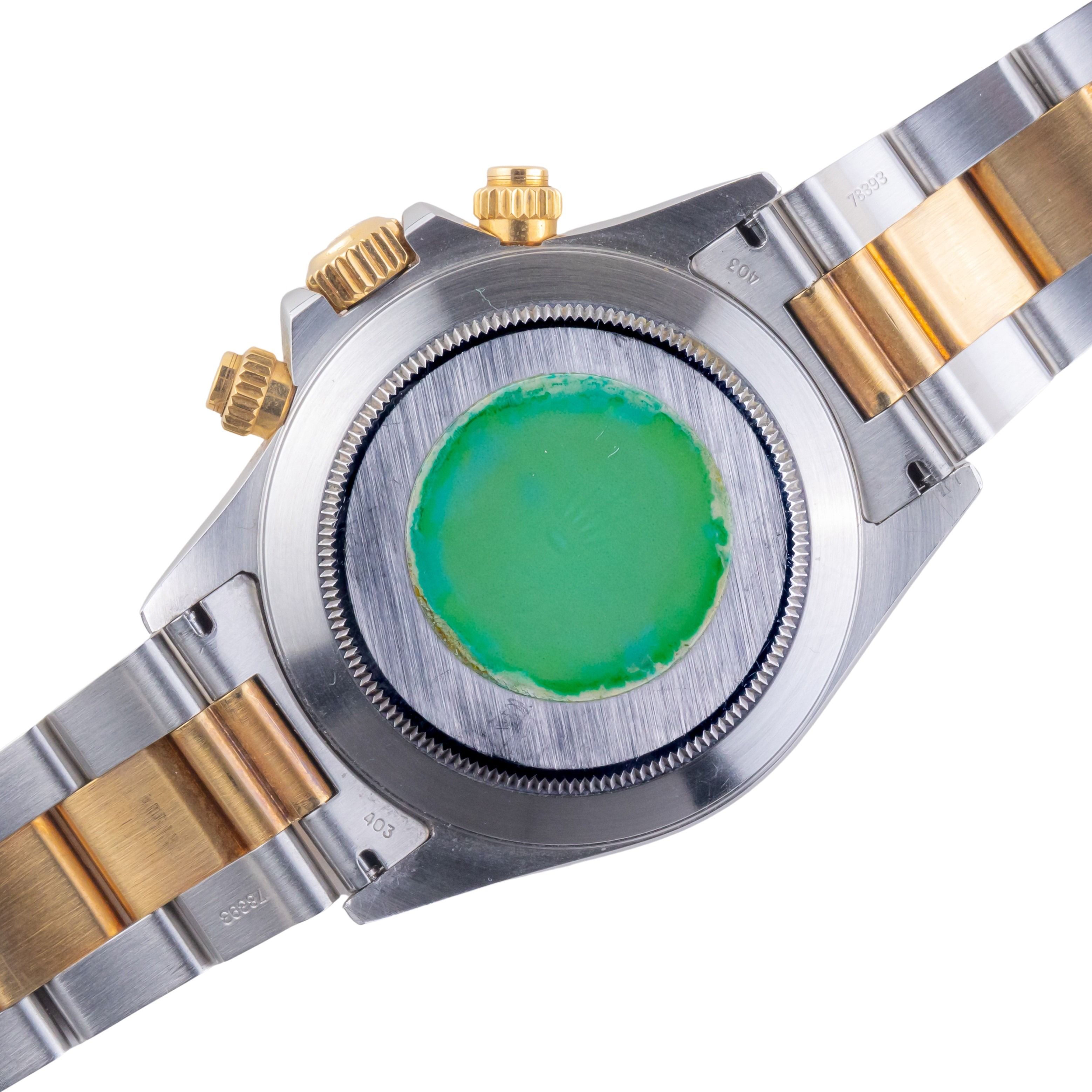 Rolex Daytona 16523 with Black dial from 1995. The Rolex Daytona reference 16523 measures a 40mm stainless steel case, a 18k yellow gold/ stainless steel Oyster bracelet and 18k Yellow gold tachymeter bezel. The Daytona 16523 is powered by an automatic movement caliber 4030 and features a scratch-resistance sapphire crystal.