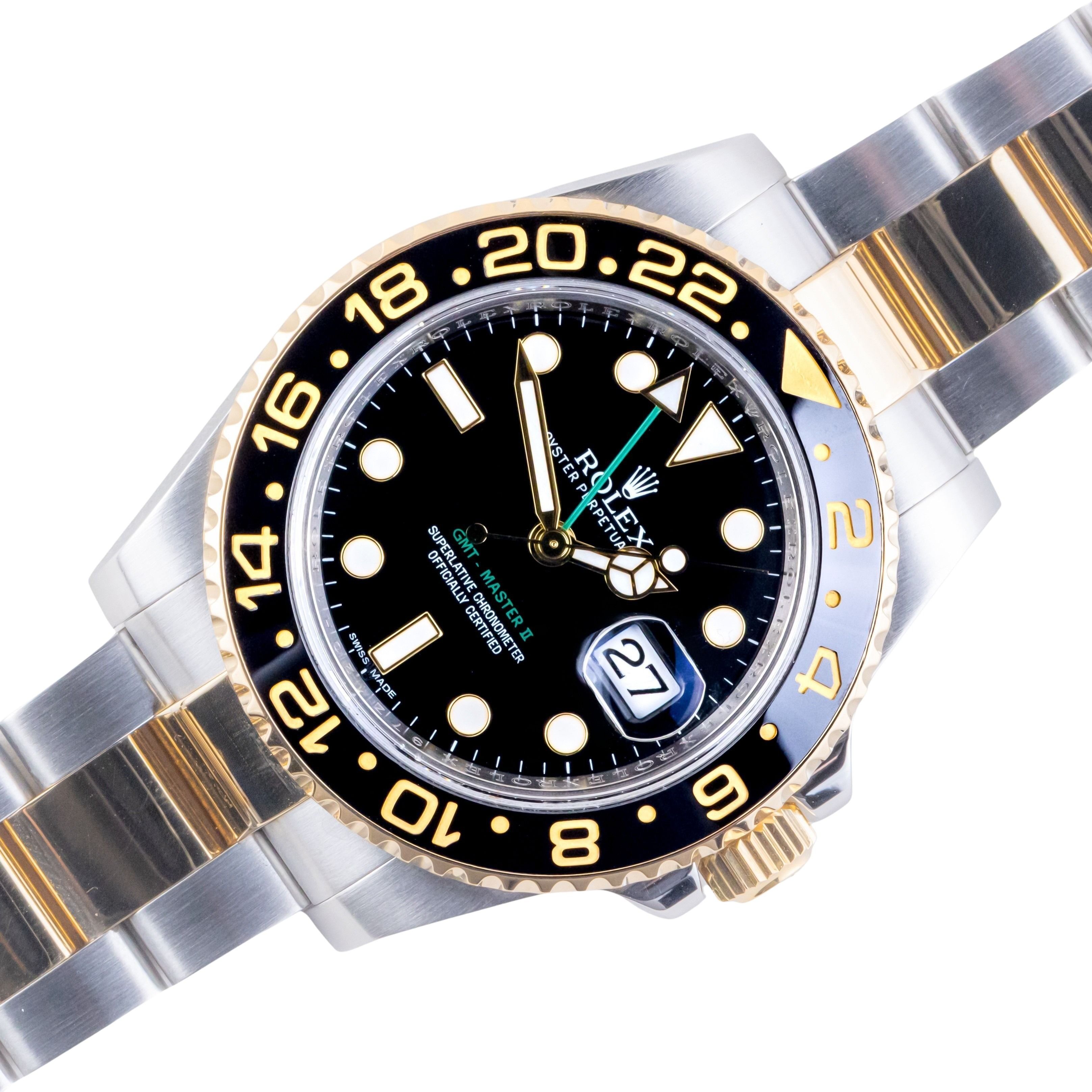 Rolex Oyster Perpetual GMT-Master II Reference 116713LN from 2014, including box and papers. The GMT-Master II features a 40 mm stainless steel case, gold/stainless steel Oyster bracelet with Fliplock clasp and rotating bezel. The GMT-Master II 116713LN has a calibre 3186 automatic movement with GMT function, scratch-resistant sapphire crystal and a black dial with Super-LumiNova.