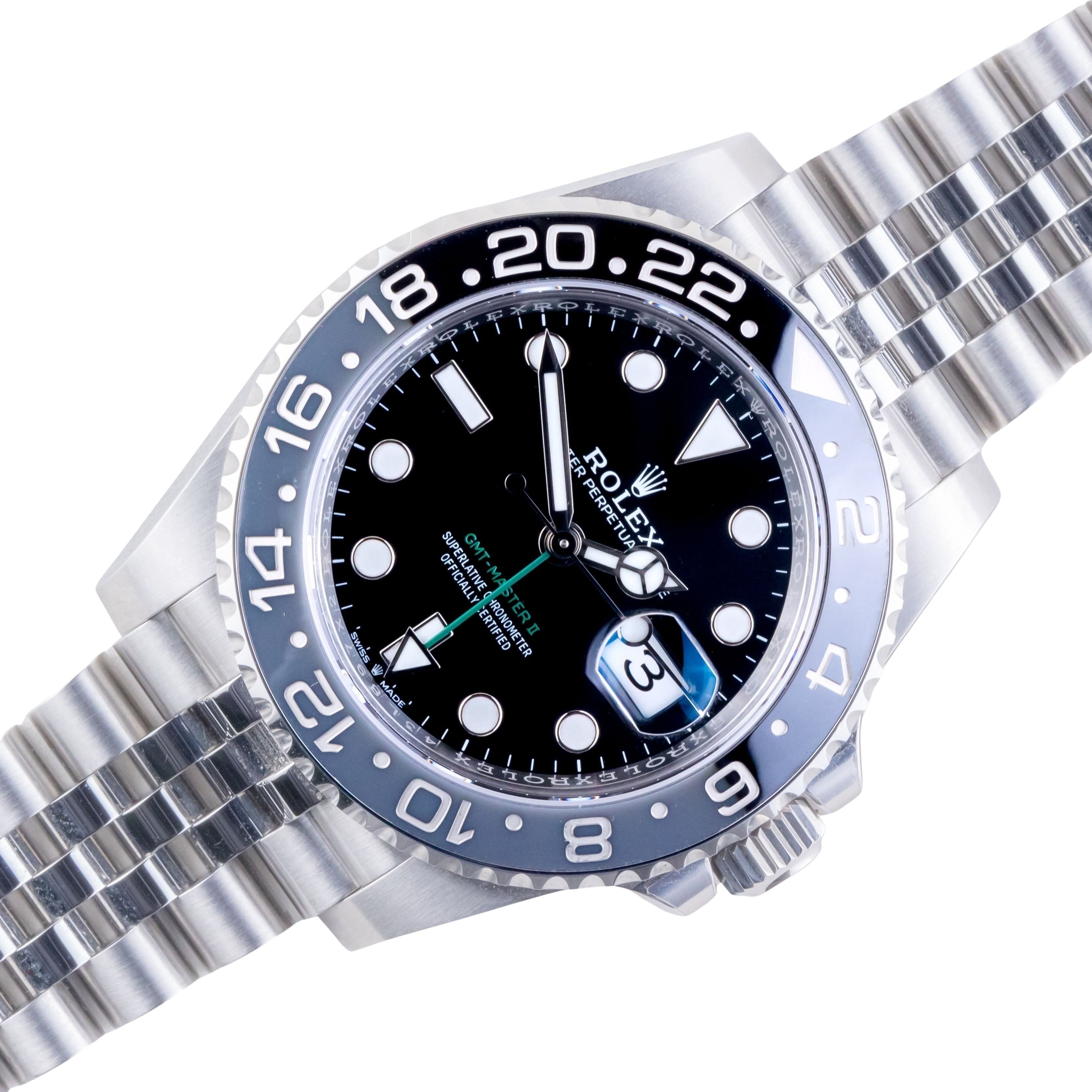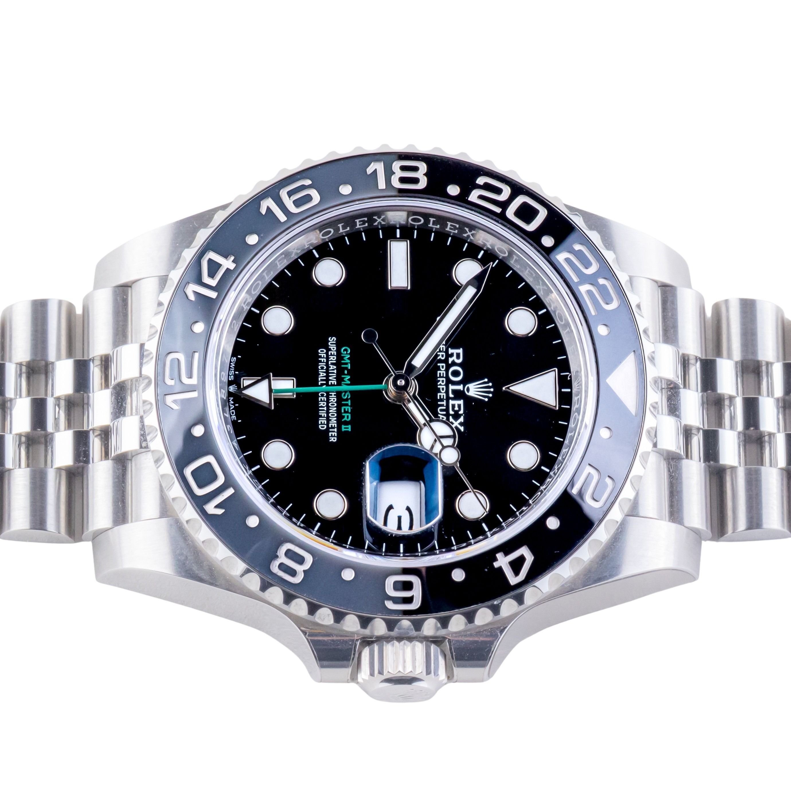 Rolex Oyster Perpetual GMT-Master II reference 126710GRNR from 2025 including box and papers. The GMT-Master II measures a 40mm stainless steel case, stainless steel jubilee bracelet w/ fliplock clasp and a rotatable bezel. The GMT-Master II 126710GRNR features an automatic movement caliber 3285 with GMT function, a scratch resistance sapphire crystal and black stick dial w/ Chromalight.
