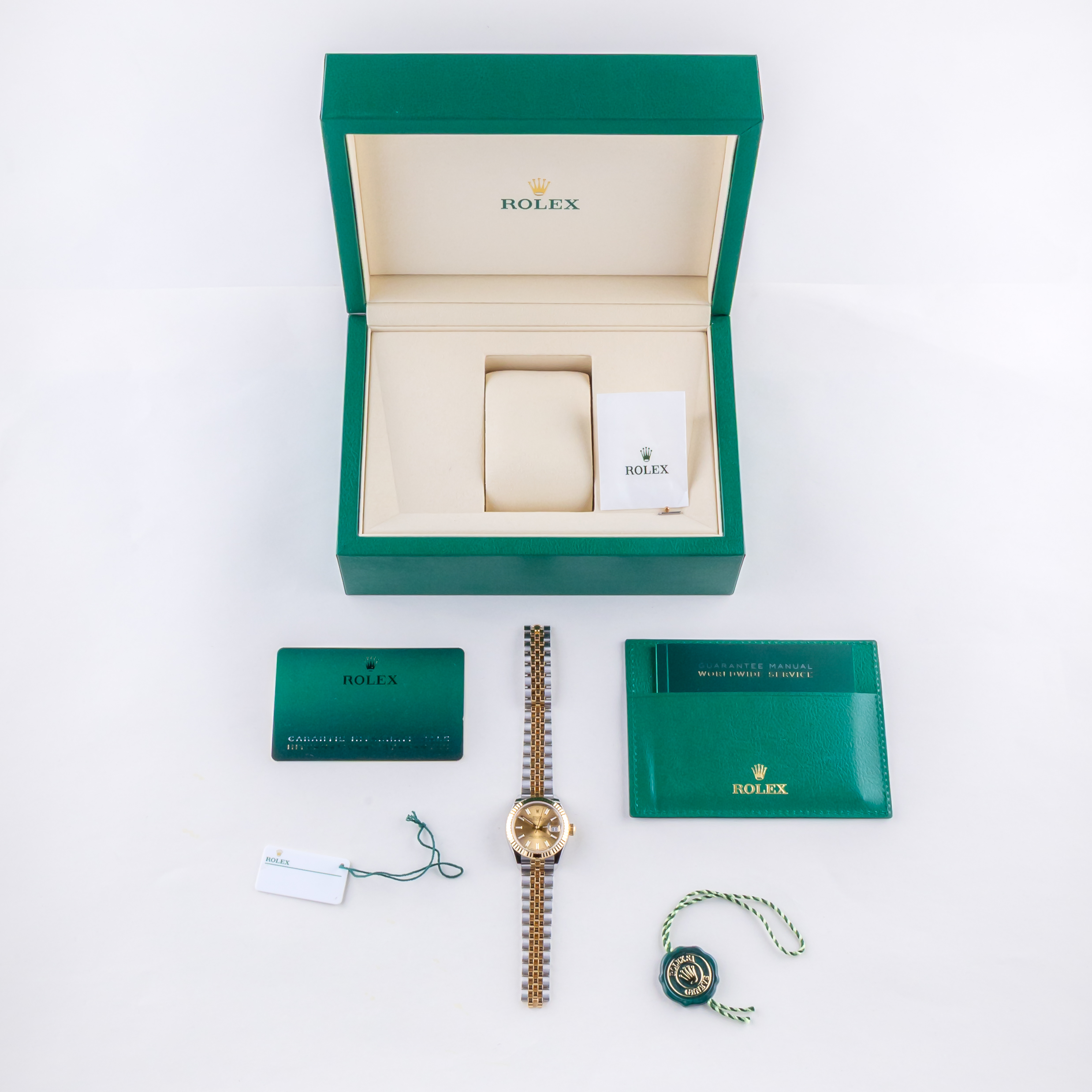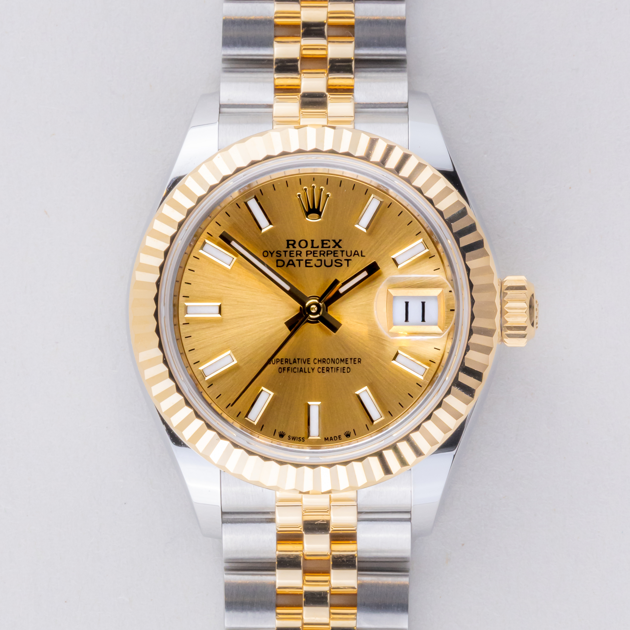 Rolex Oyster Perpetual Lady-Datejust reference 279173 from 2025 including full set. The Lady-Datejust 279173 measures a 28mm stainless steel case, a stainless steel/ yellow gold jubilee bracelet with concealed crownclasp, and a fluted 18k yellow gold bezel. This Lady-Datejust 279173 features an automatic movement caliber 2235 with quickset date function, a scratch resistance sapphire crystal and a champagne dial.