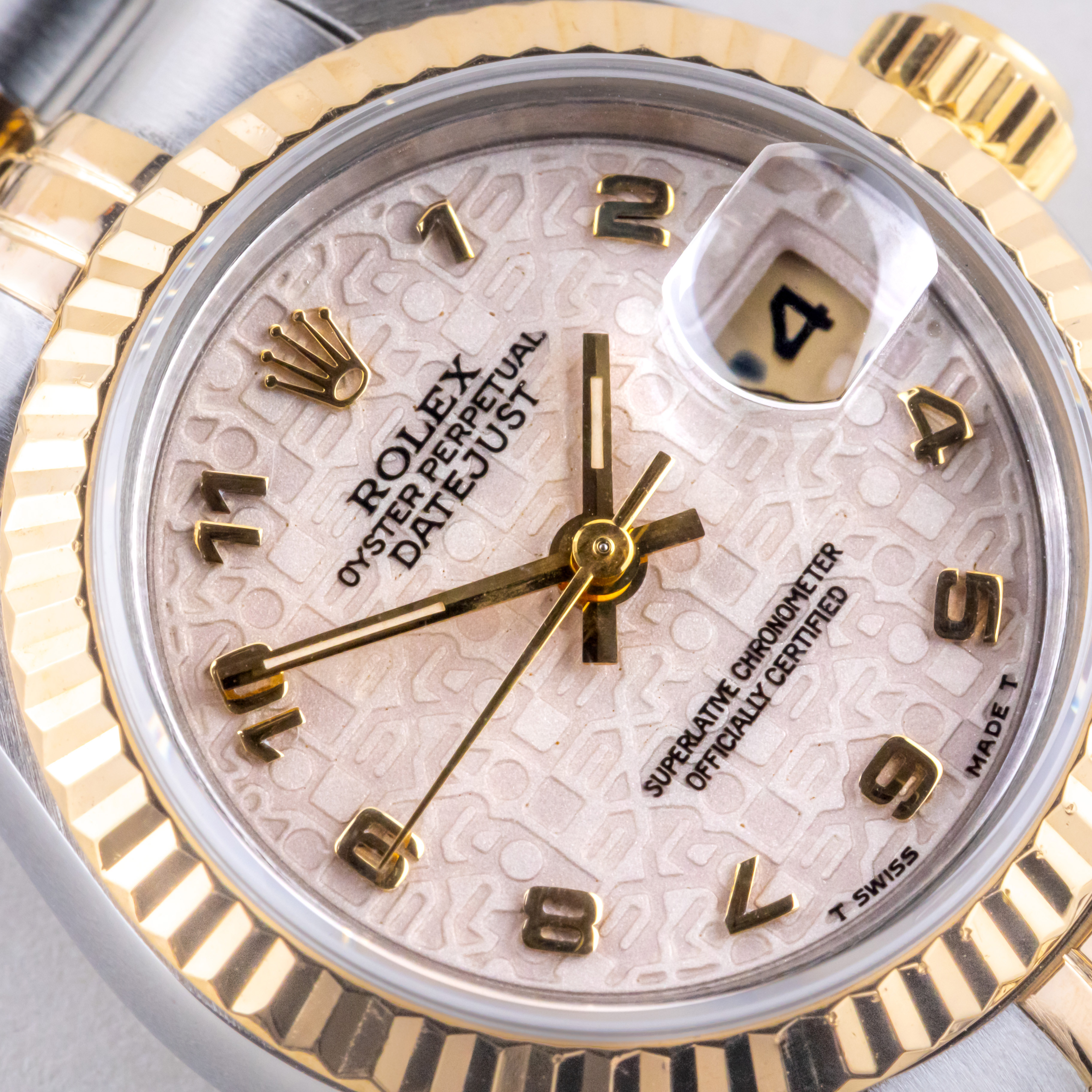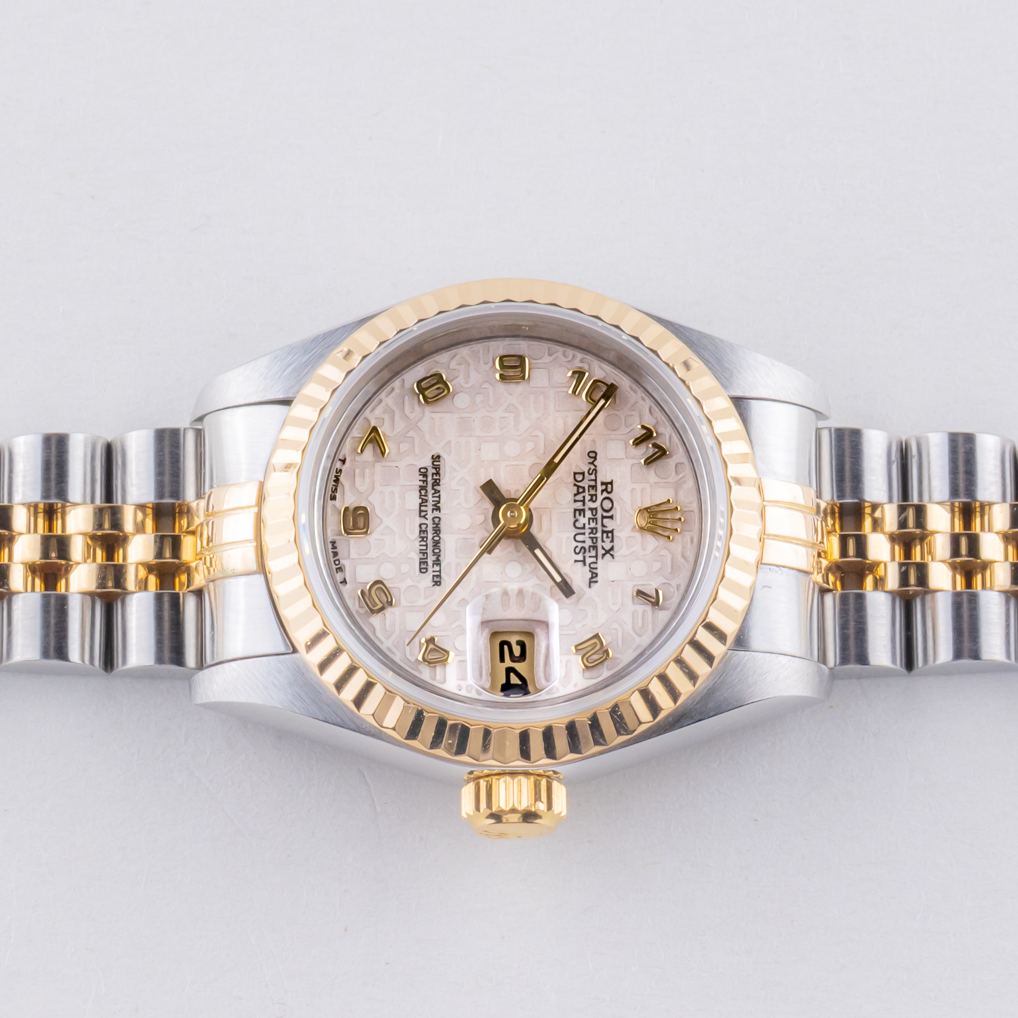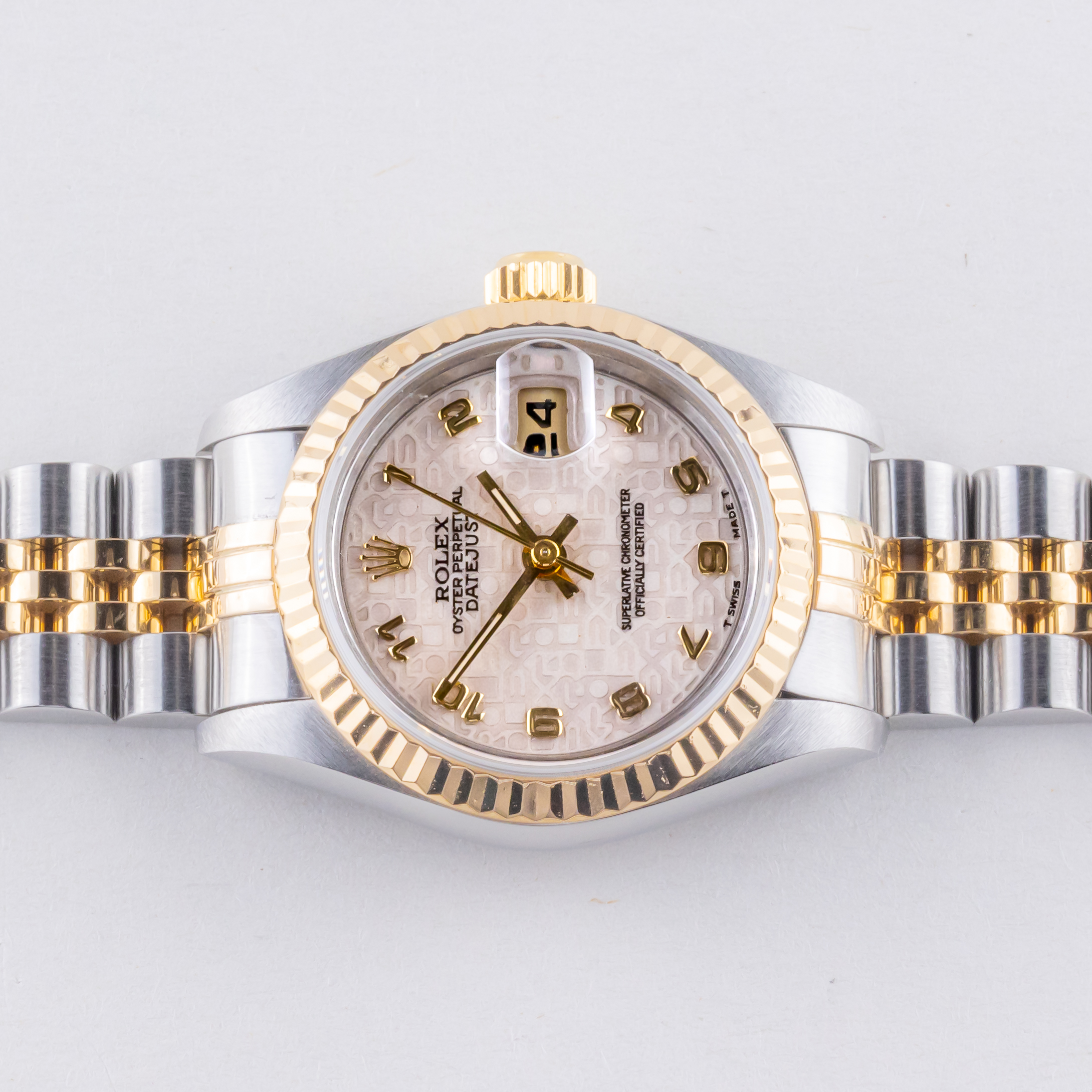 Rolex Oyster Perpetual Lady-Datejust reference 69173 from 1995 including full set. The Lady-Datejust 69173 measures a 26mm gold and stainless steel case, two-tone jubilee bracelet and fluted 14k gold bezel. This Lady-Datejust 69173 features an automatic movement caliber 2135 with quickset date function, a scratch resistance sapphire crystal and a creme dial w/ tritium hands and Arabic markers.