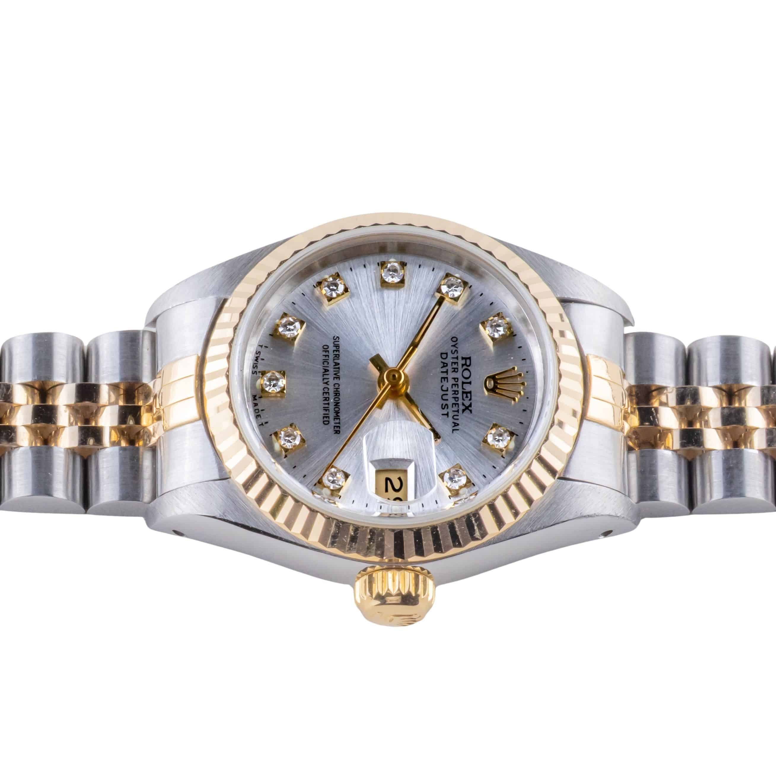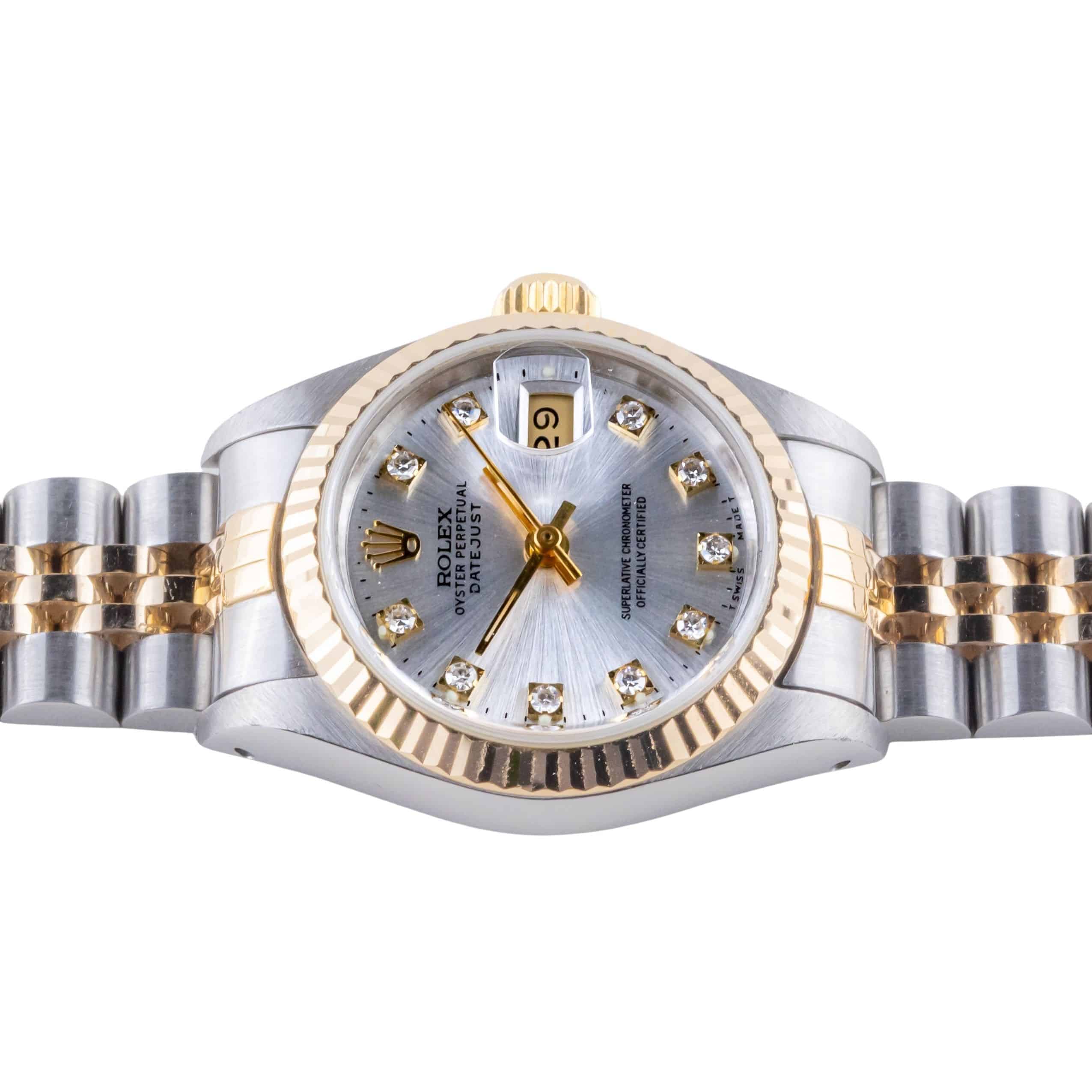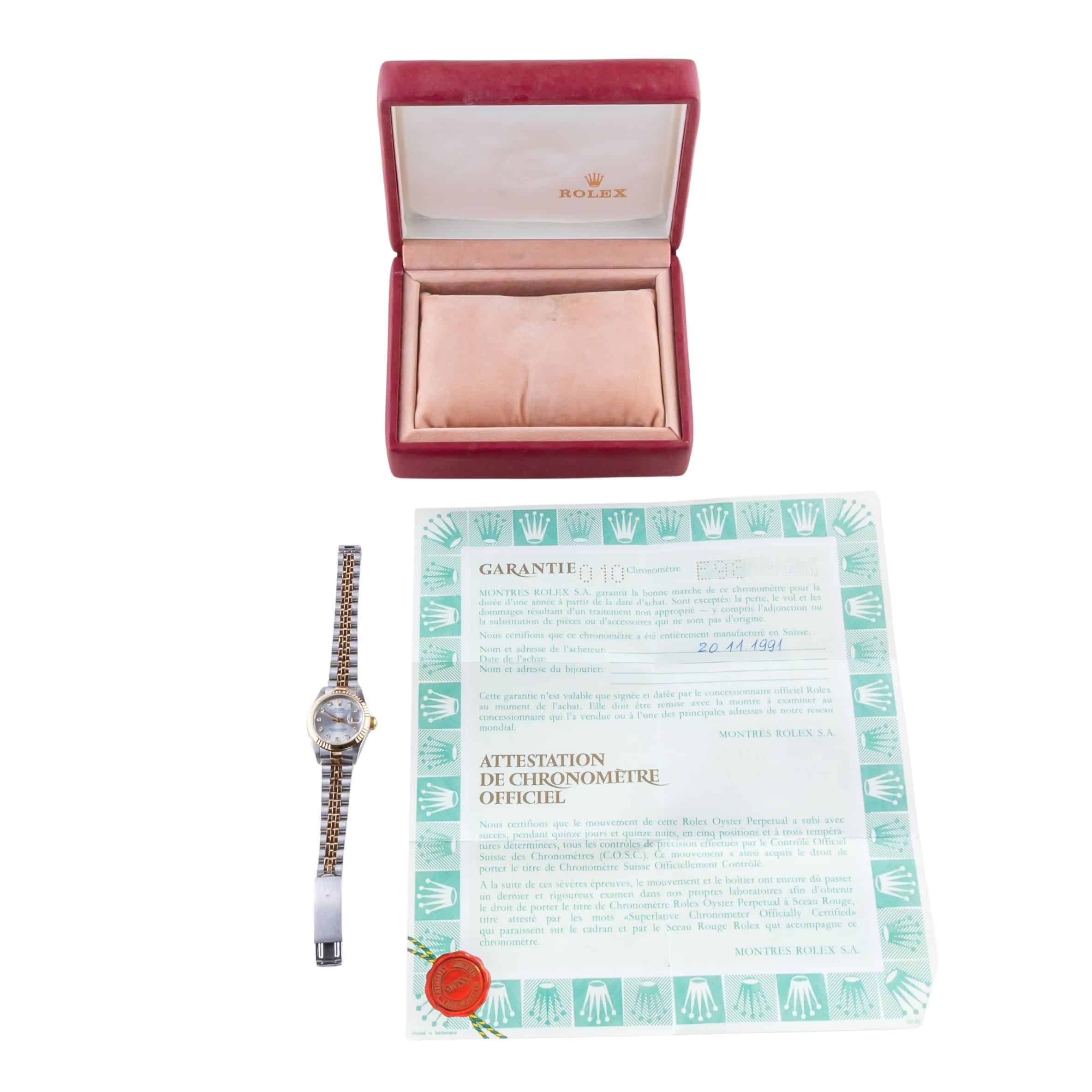 Rolex Oyster Perpetual Lady-Datejust reference 69173 from 1990 including full set. The Lady-Datejust 69173 measures a 26mm gold and stainless steel case, two-tone jubilee bracelet and fluted 14k gold bezel. This Lady-Datejust 69173 features an automatic movement caliber 2135 with quickset date function, a scratch resistance sapphire crystal and a silver dial w/ tritium hands and diamond index.