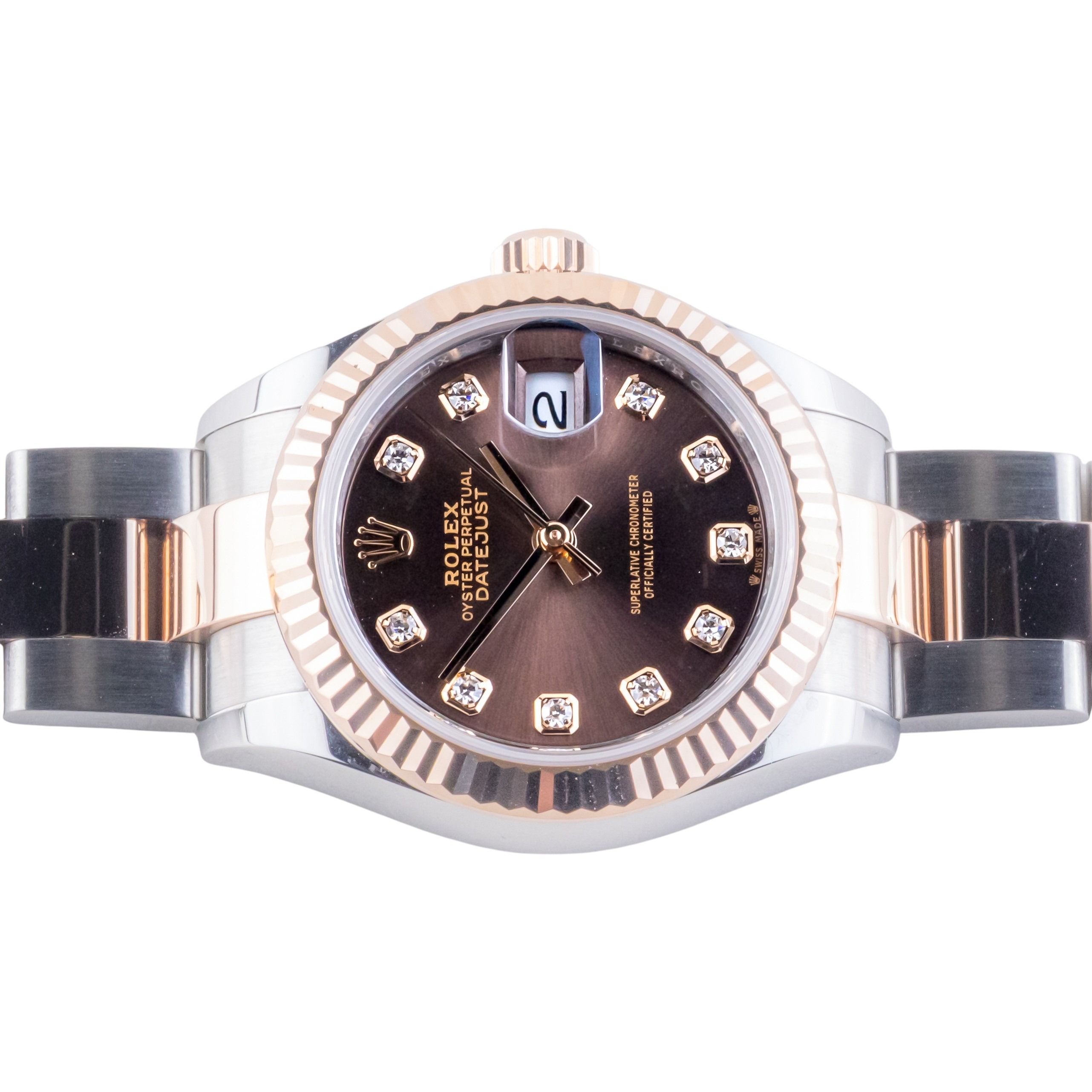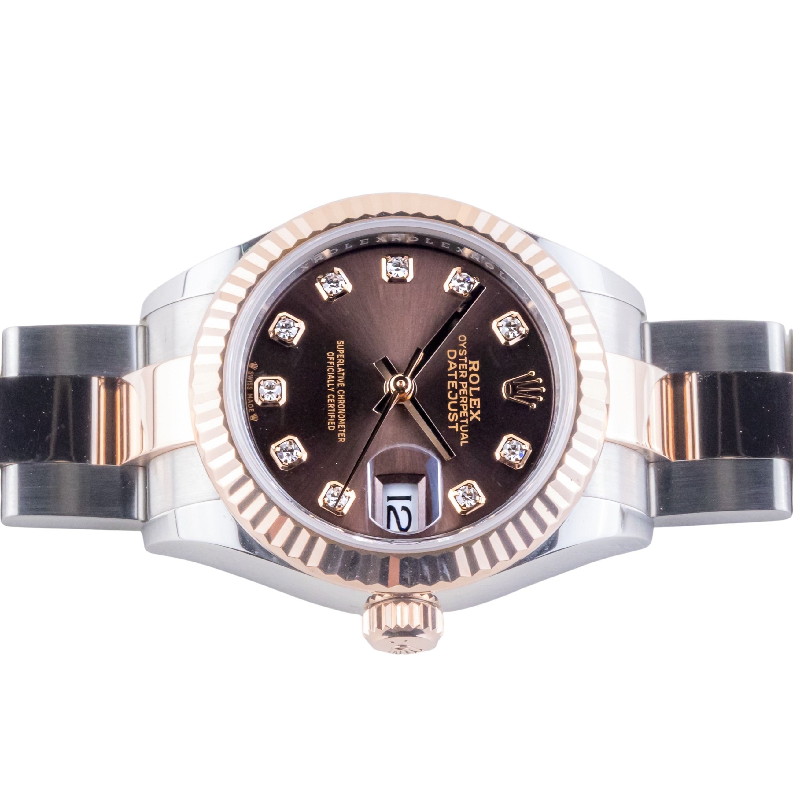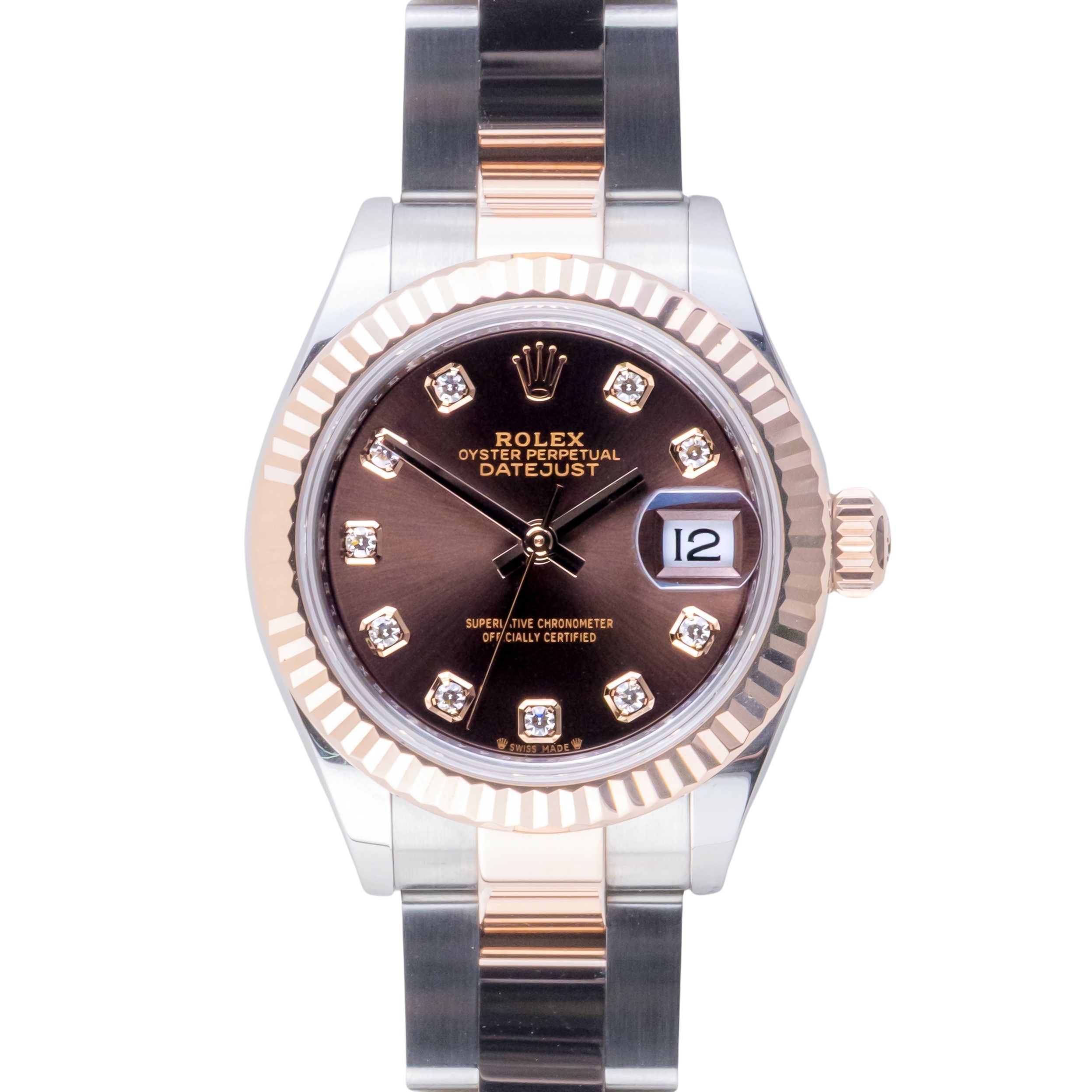 Rolex Oyster Perpetual Lady-Datejust reference 279171 from 2024 including full set. The Lady-Datejust 279171 measures a 28mm rose gold and stainless steel case, a two-tone jubilee bracelet with concealed crownclasp, and a fluted18k rose gold bezel. This Lady-Datejust 279171 features an automatic movement caliber 2236 with quickset date function, a scratch resistance sapphire crystal and choco dial with diamond numerals.