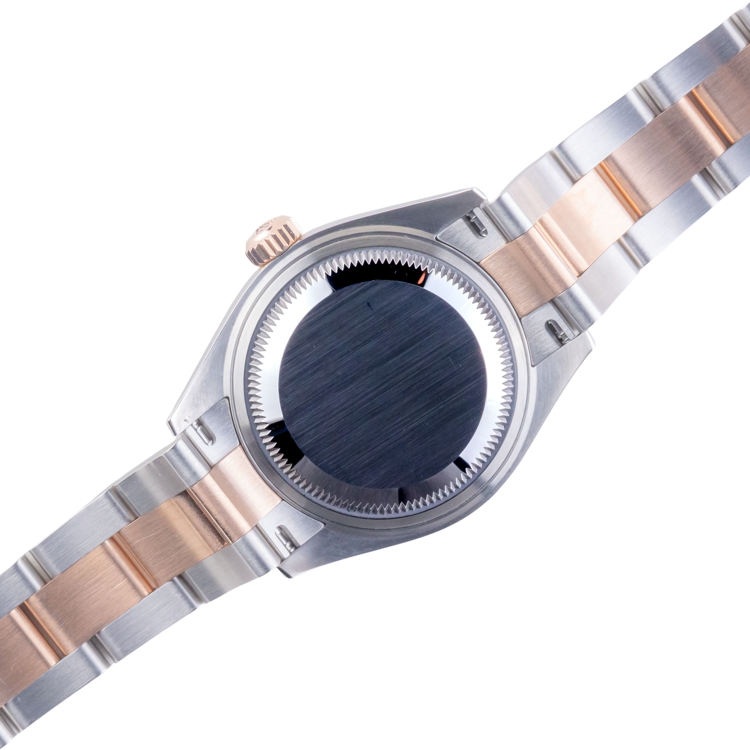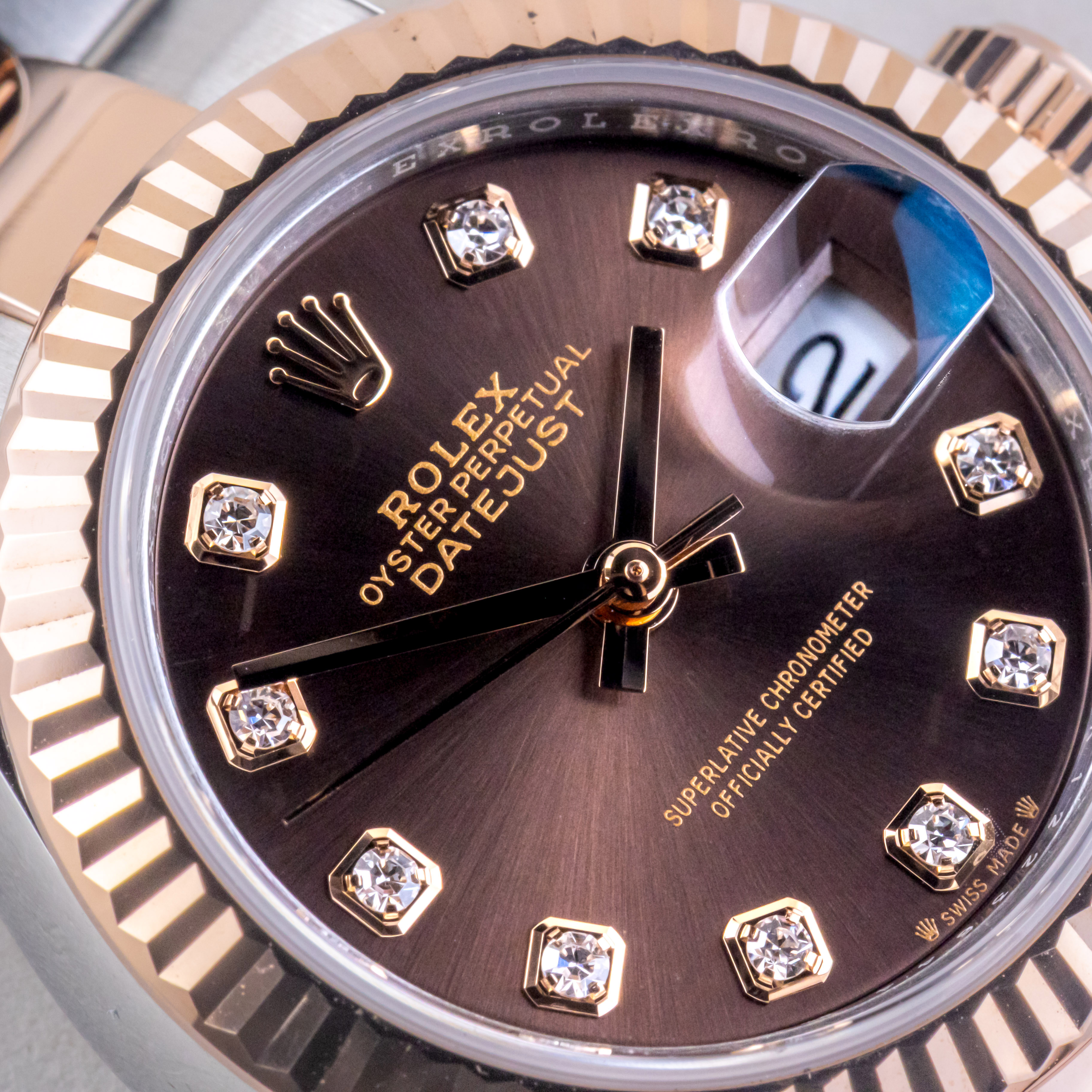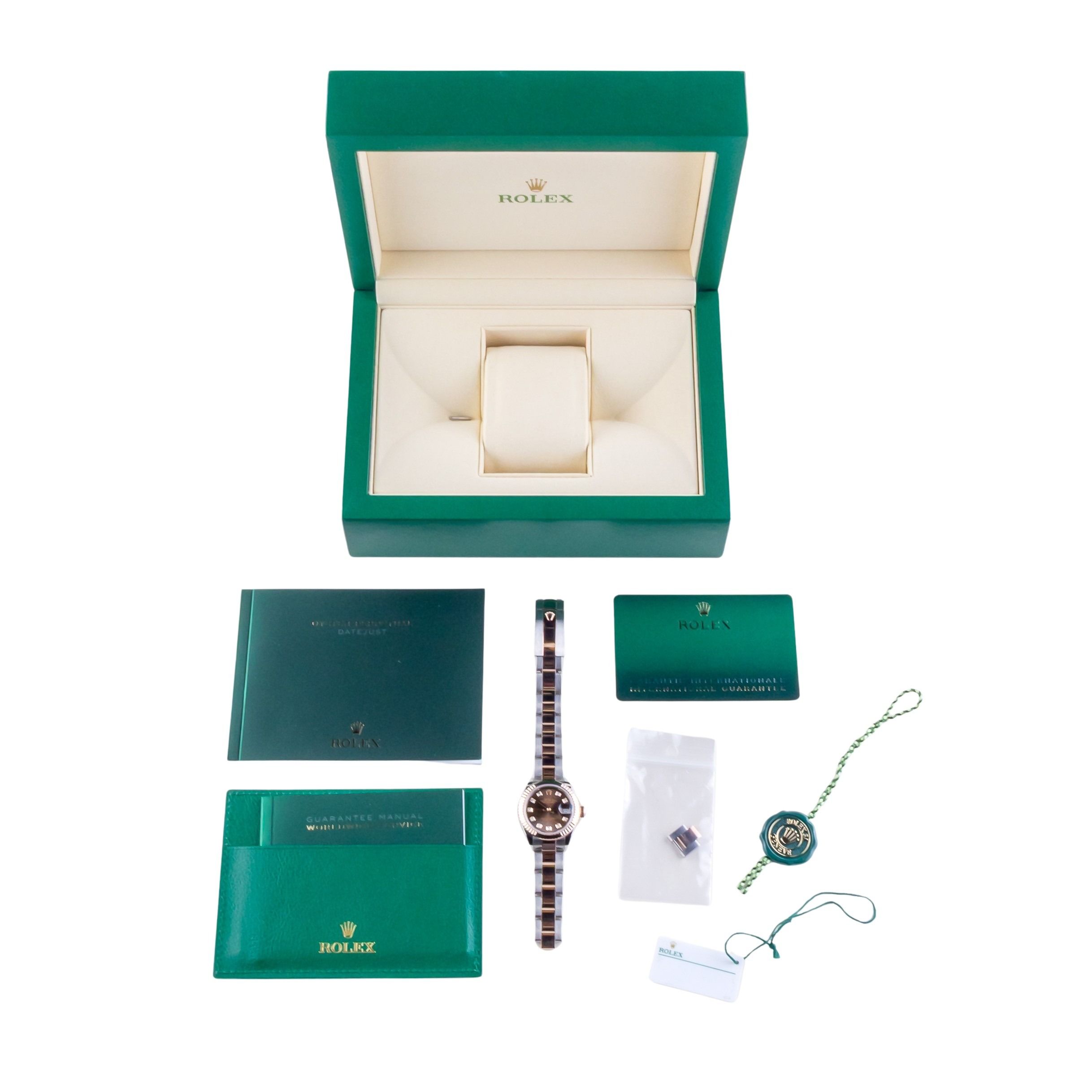 Rolex Oyster Perpetual Lady-Datejust reference 279171 from 2024 including full set. The Lady-Datejust 279171 measures a 28mm rose gold and stainless steel case, a two-tone jubilee bracelet with concealed crownclasp, and a fluted18k rose gold bezel. This Lady-Datejust 279171 features an automatic movement caliber 2236 with quickset date function, a scratch resistance sapphire crystal and choco dial with diamond numerals.