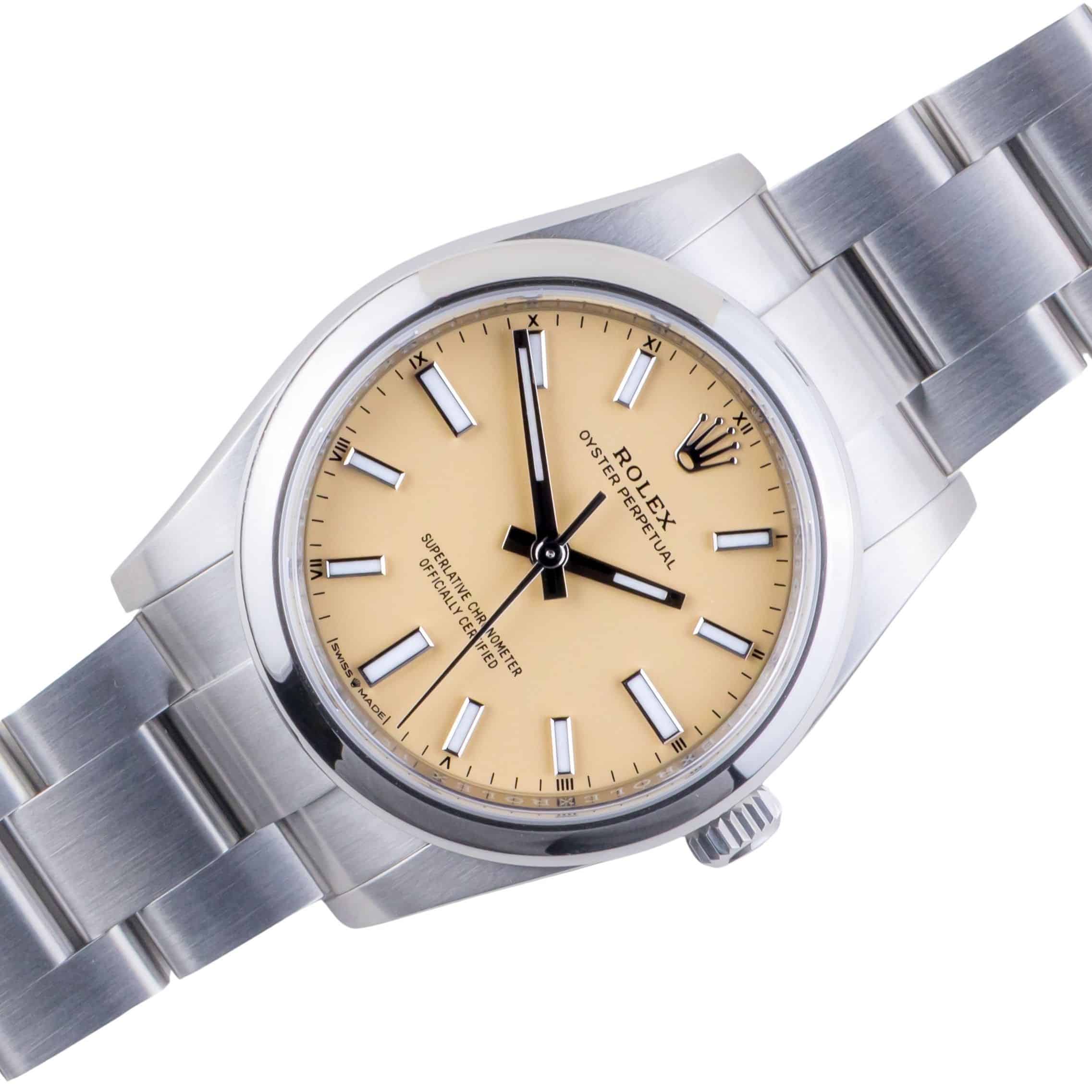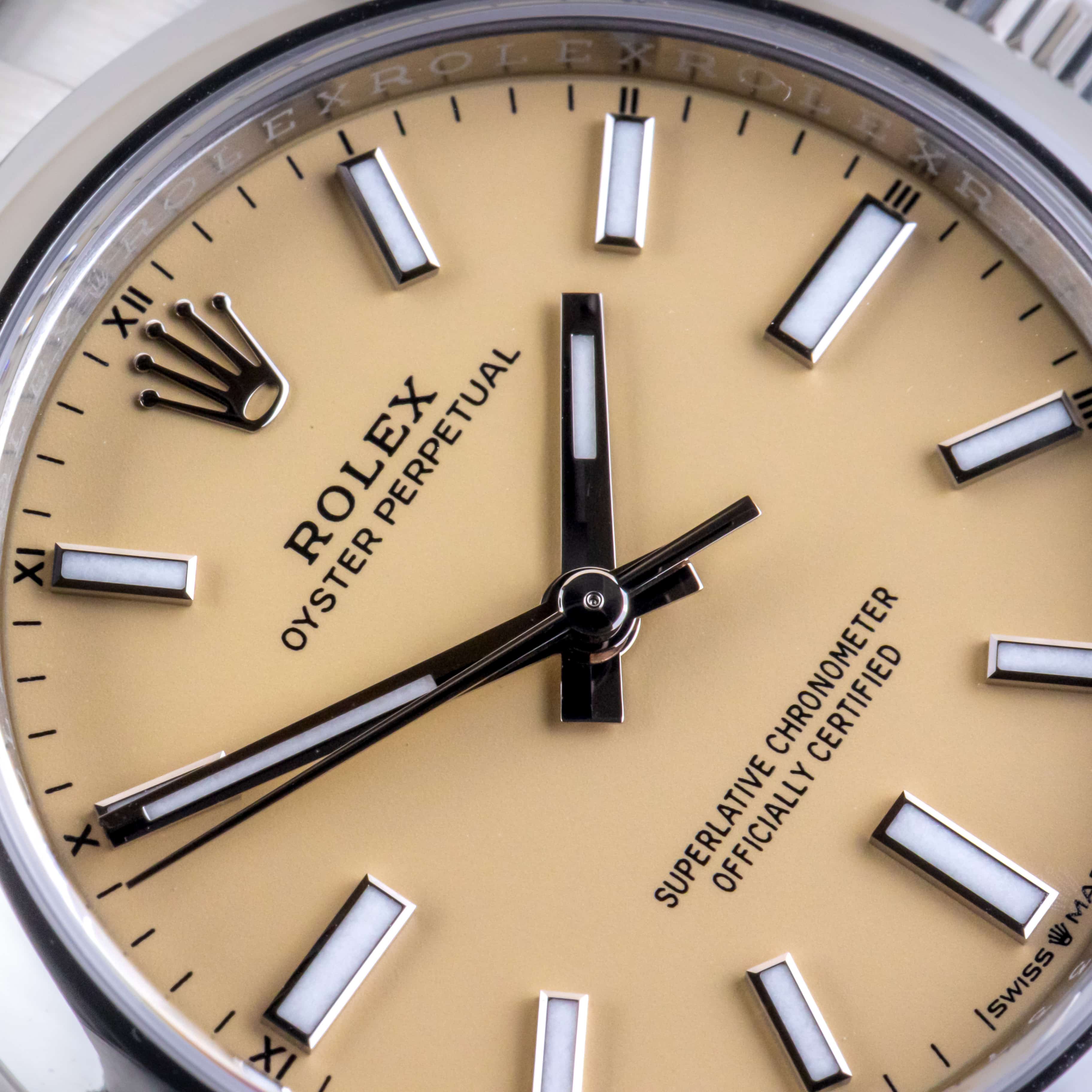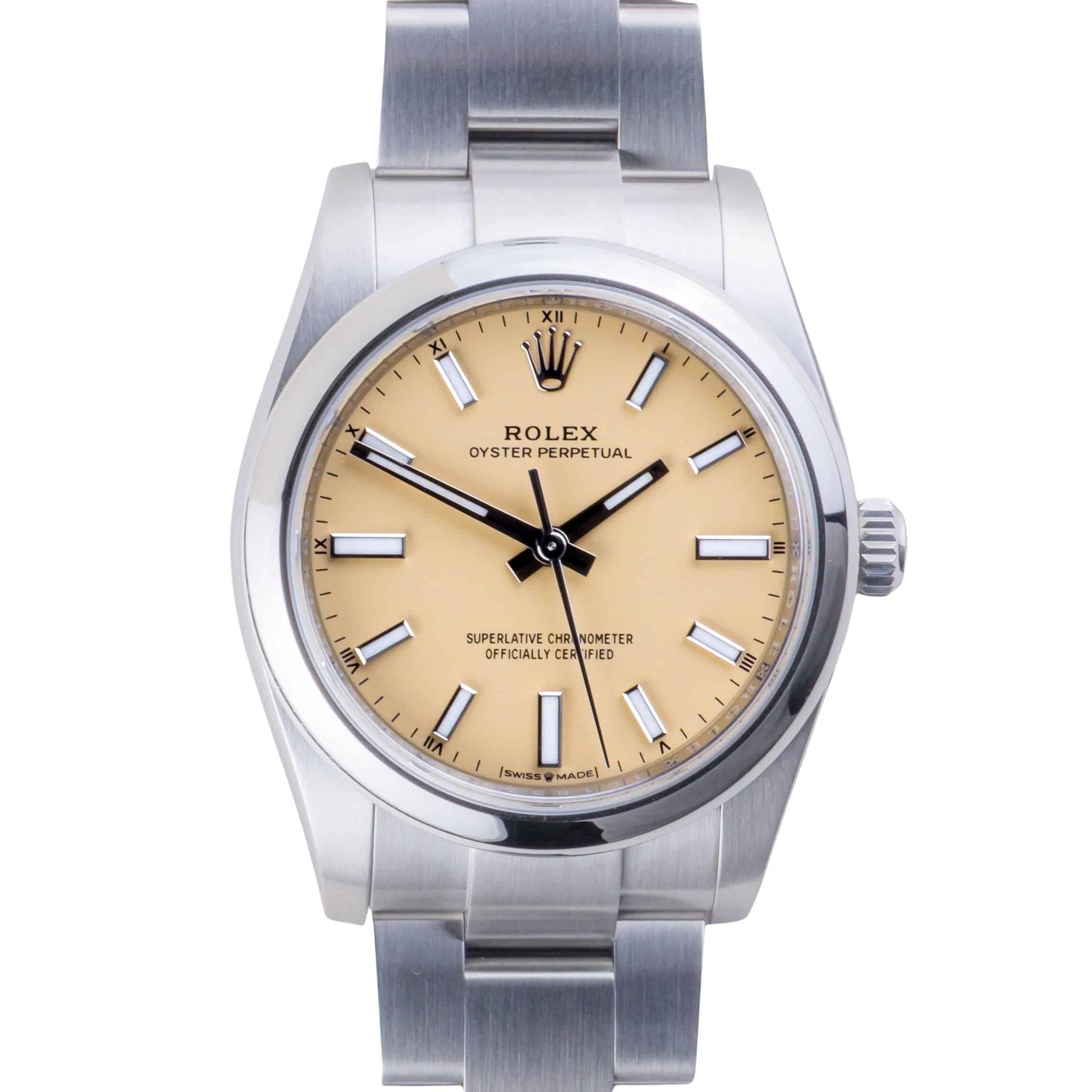 NEW Rolex Oyster Perpetual reference 124200 from 2025 including full set set. The Oyster Perpetual reference 124200 measures a 34mm stainless steel case, a stainless steel Oyster bracelet with Oysterclasp and smooth stainless steel bezel. The Oyster Perpetual reference 124200 features an automatic movement caliber 2232, a scratch resistance sapphire crystal and beige dial with chromalight display.
