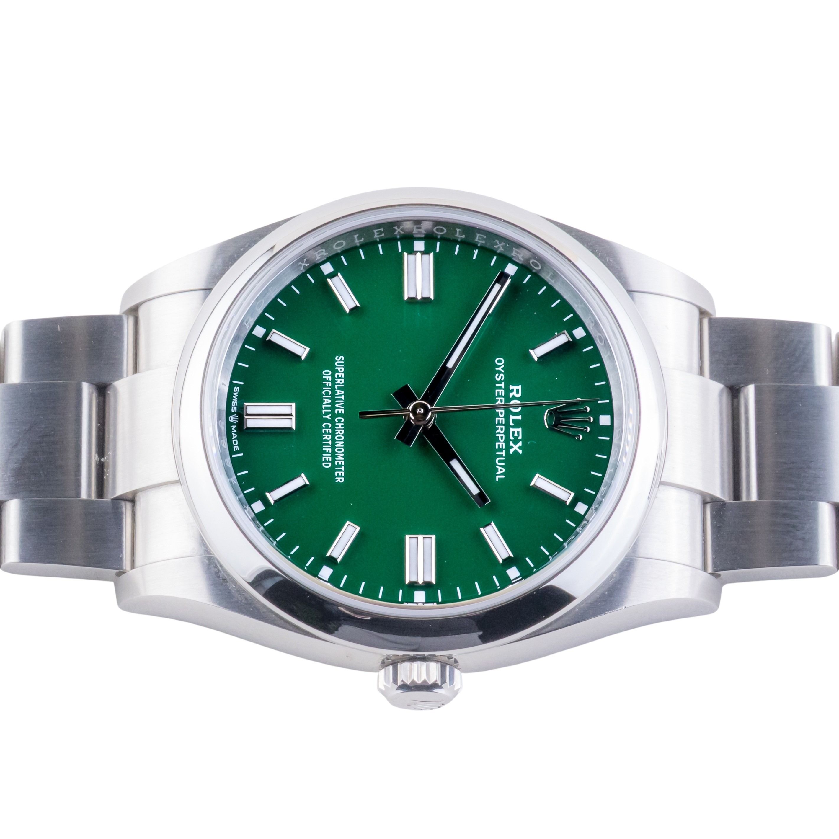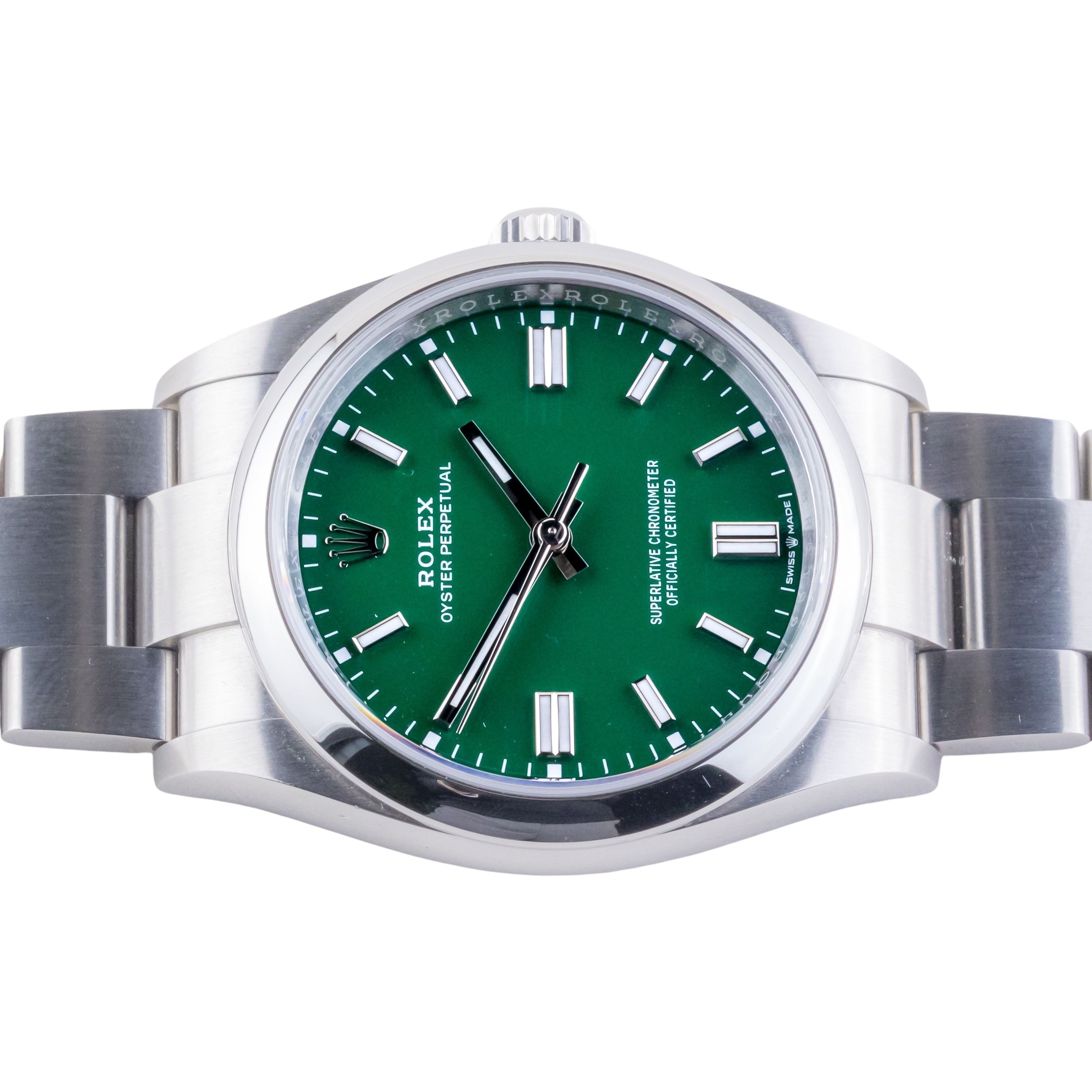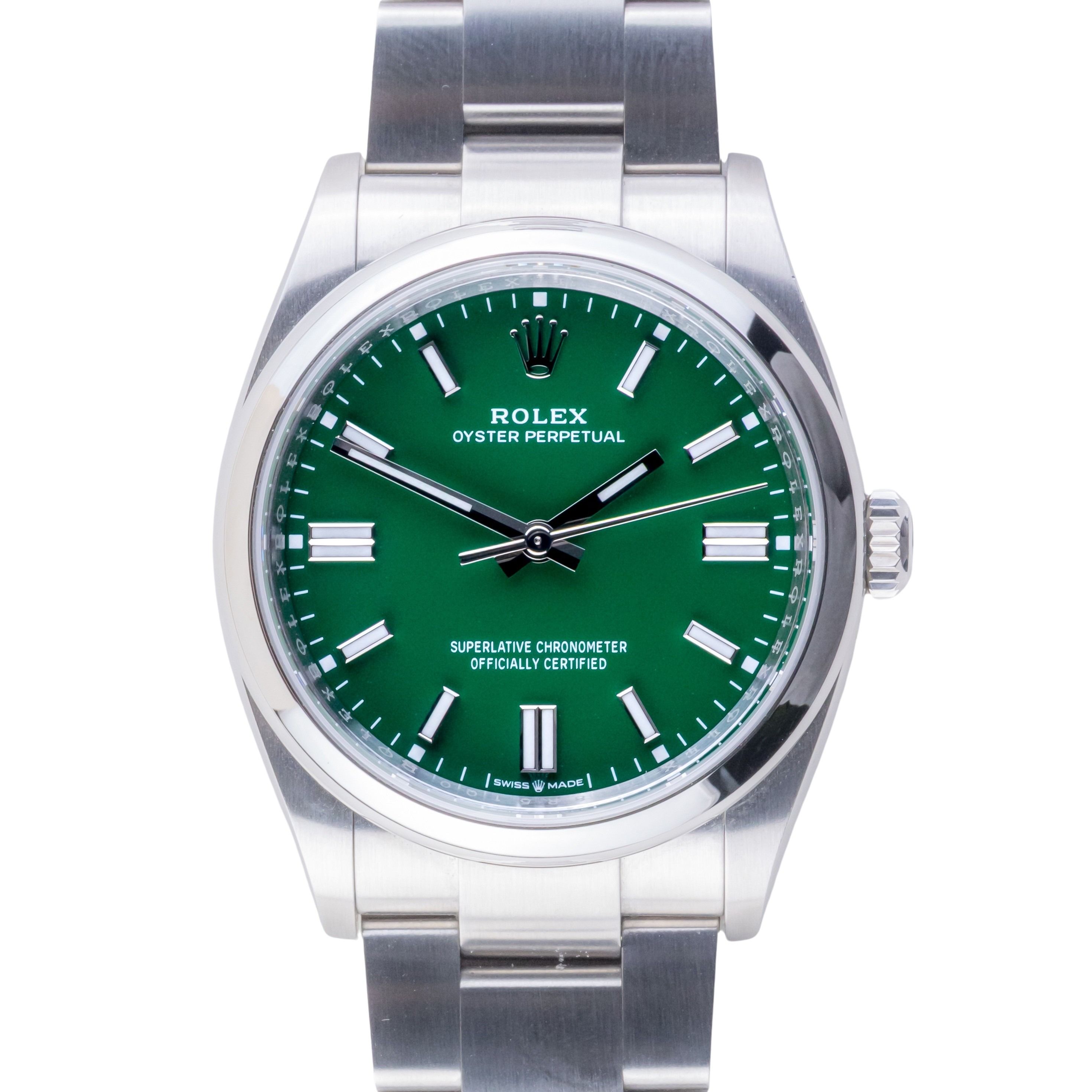Rolex Oyster Perpetual reference 126000 from 2024 including full set set. The Oyster Perpetual reference 126000 measures a 36mm stainless steel case, a stainless steel Oyster bracelet with Oysterclasp and smooth stainless steel bezel. The Oyster Perpetual reference 126000 features an automatic movement caliber 3230, a scratch resistance sapphire crystal and Green dial with chromalight display.