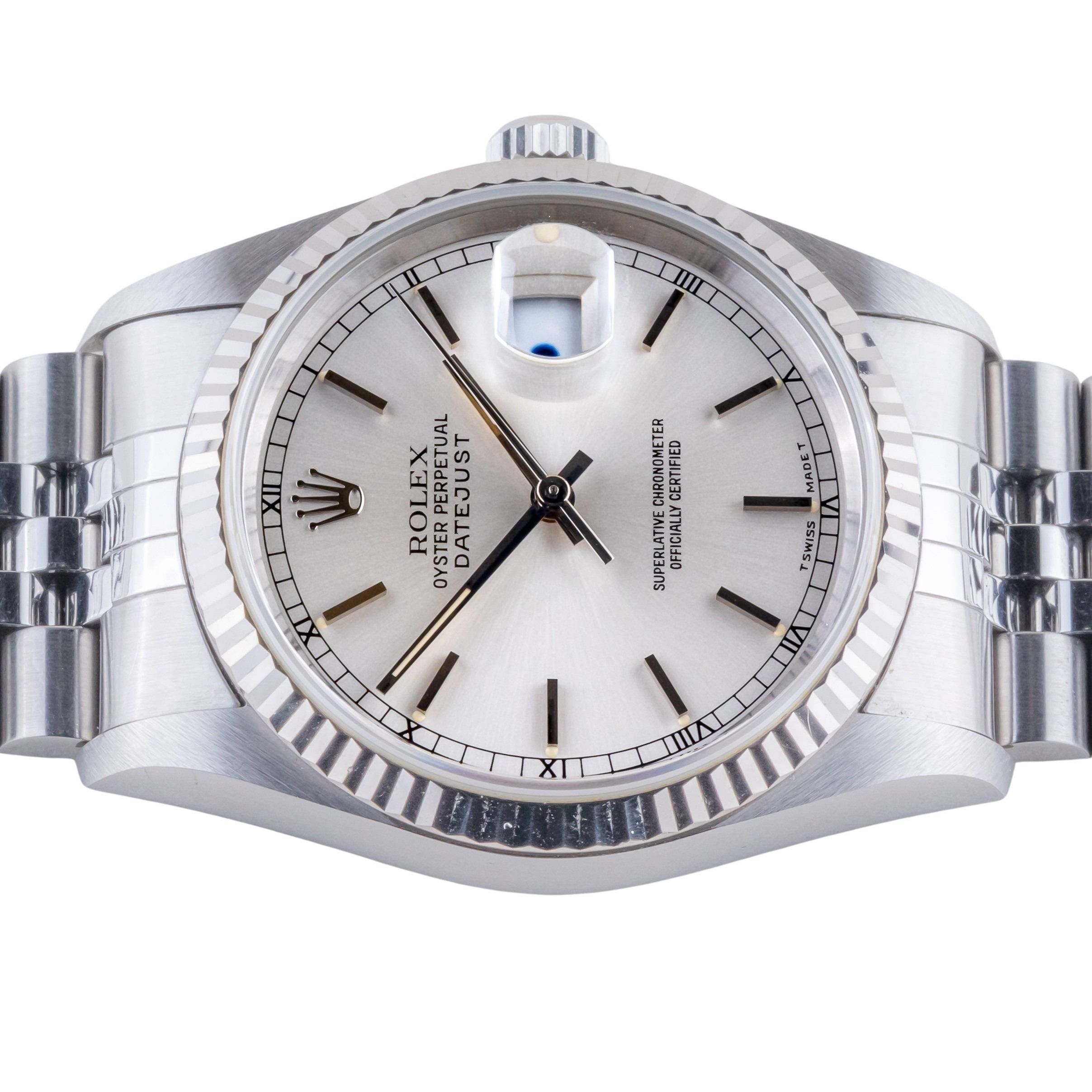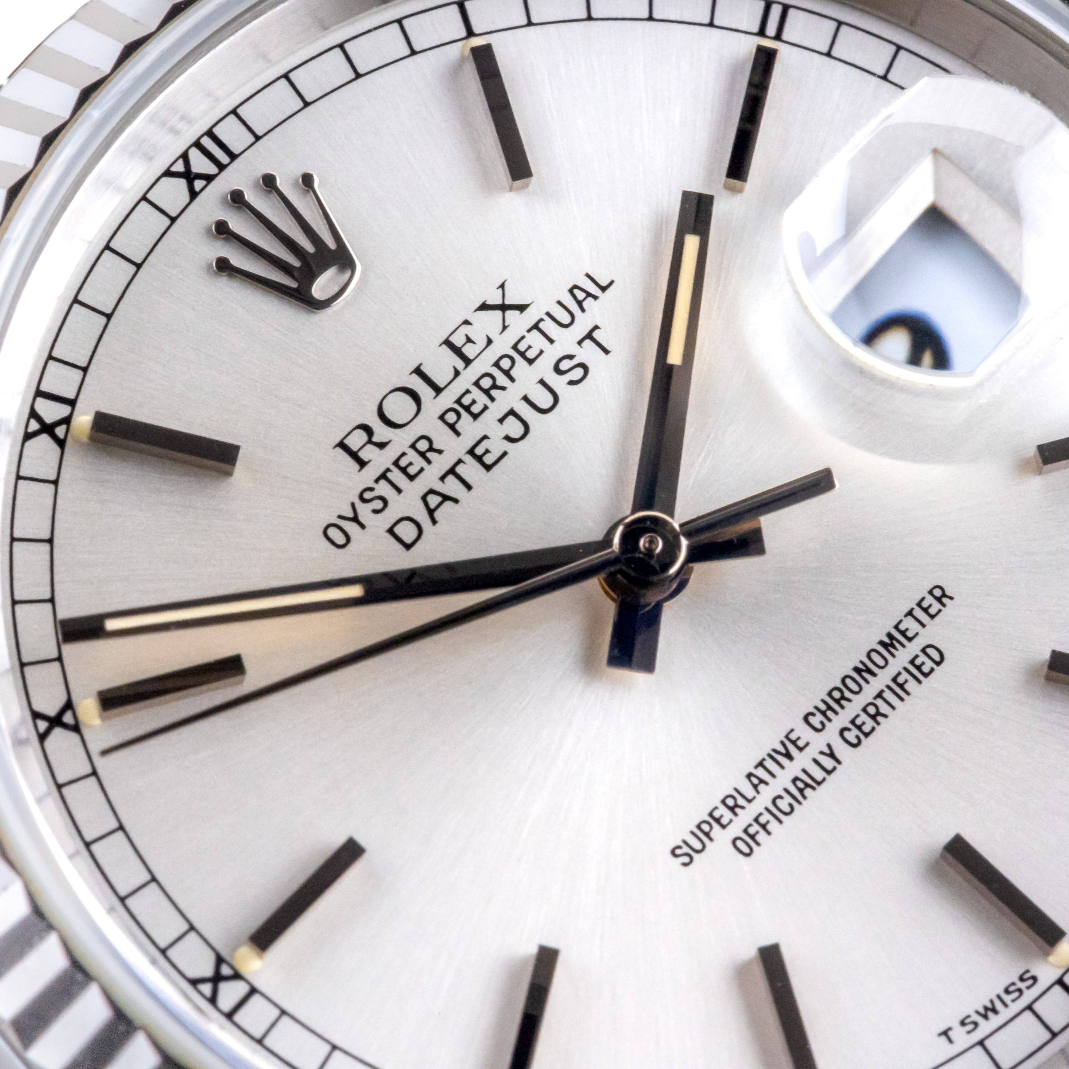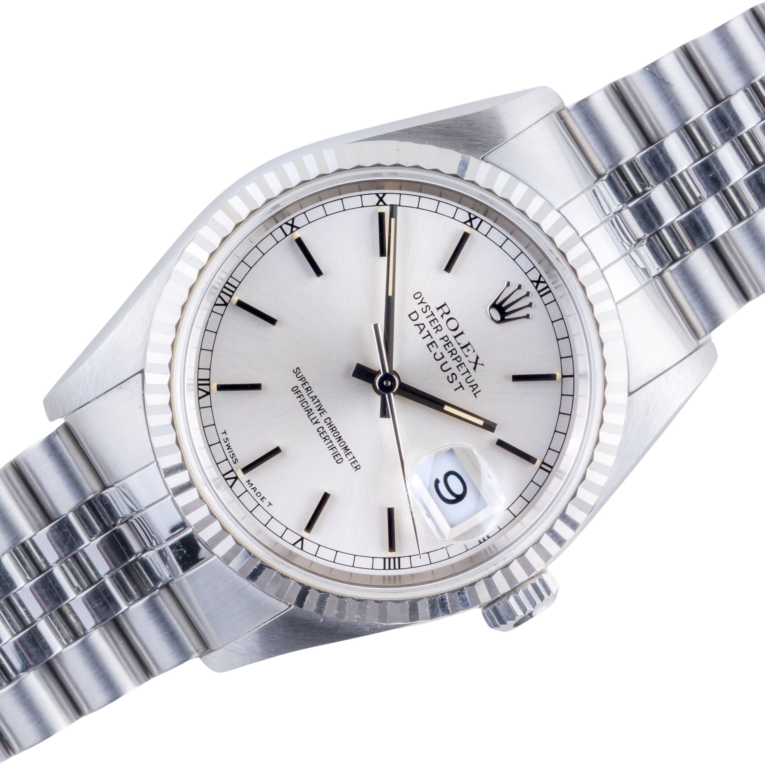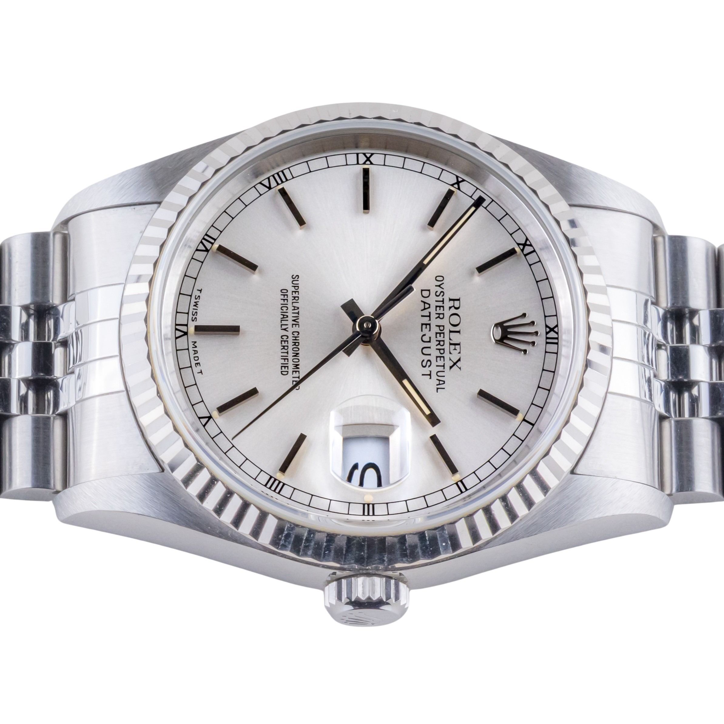 Rolex Oyster Perpetual Datejust reference 16234 from 1997. The Datejust 16234 Datejust measures a 36mm stainless steel case, a stainless steel Jubilee bracelet and a fluted 18k white gold bezel. This Datejust 16234 features an automatic movement caliber 3135 with quickset date function, a scratch resistance sapphire crystal and a silver dial.