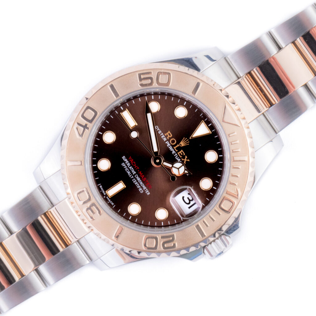 Rolex Oyster Perpetual Yacht-Master Reference 268621 from 2018 including full set. The Yacht-Master 268621 measures a 35mm stainless steel case, a two-tone Oyster bracelet w/ Fliplock clasp and a 18K rose gold bidirectional time-lapse bezel. The Yacht-Master 268621 features an automatic movement caliber 2236 with quickset date function, a scratch resistance sapphire crystal and brown colored dial with superluminova display.