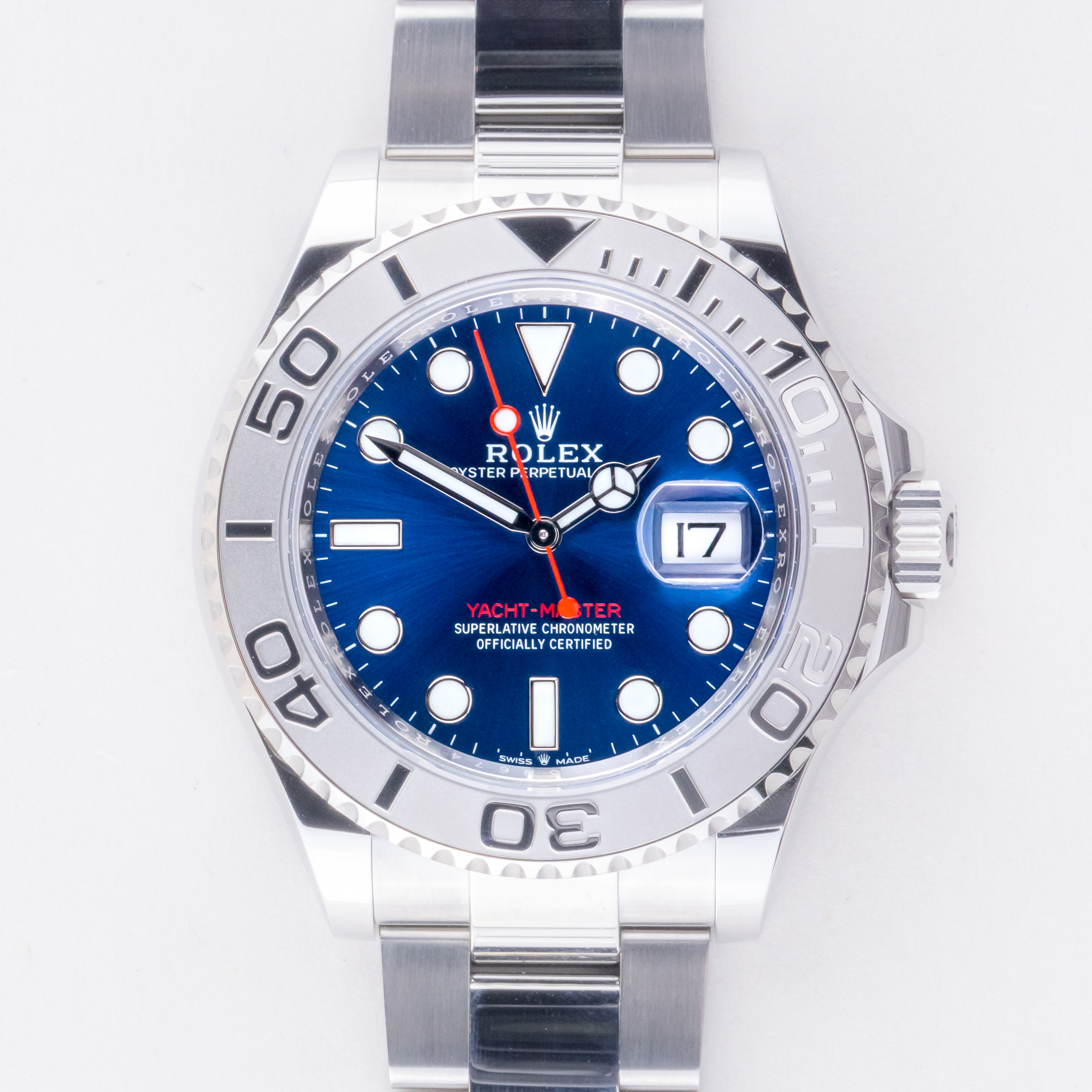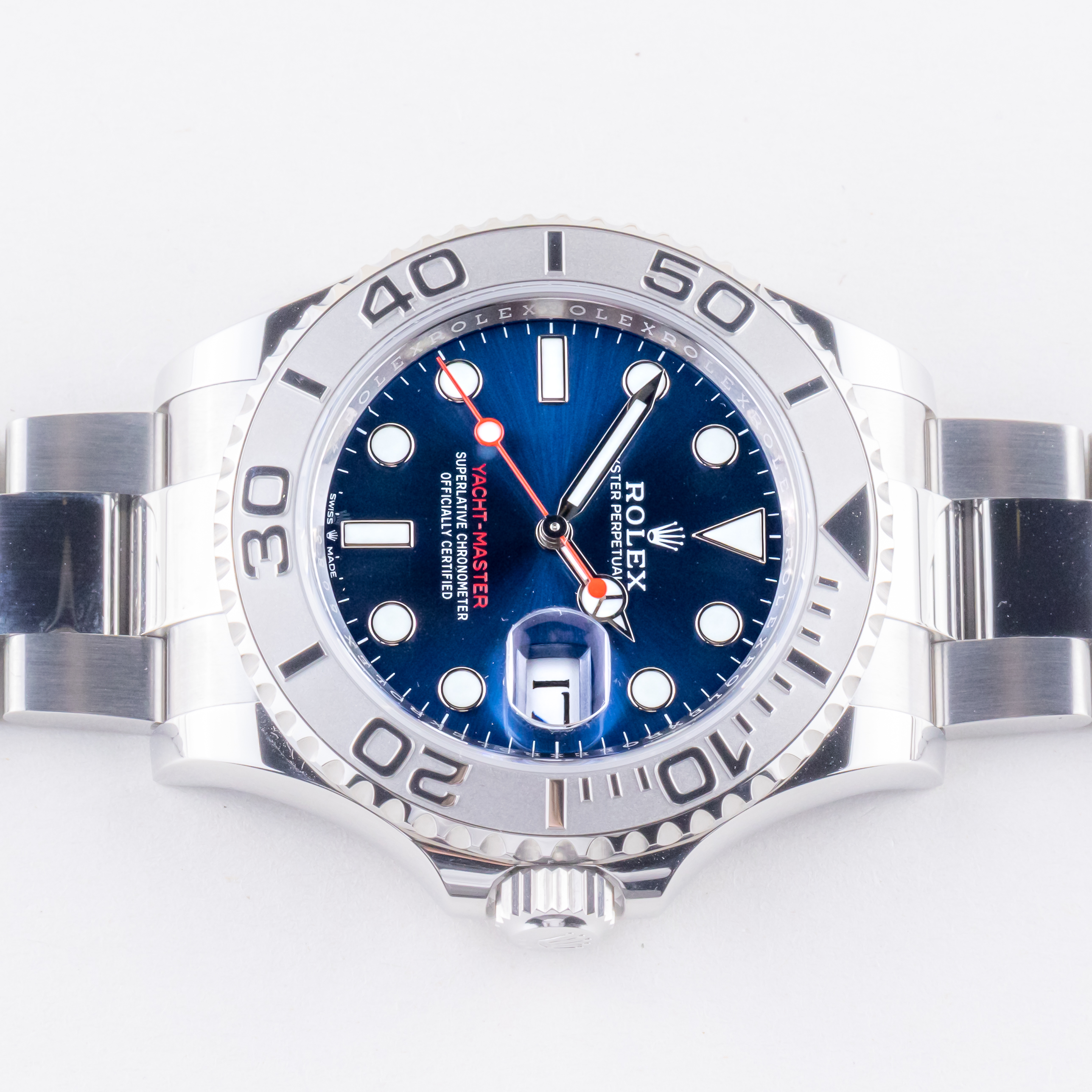 NEW Rolex Oyster Perpetual Yacht-Master Reference 126622 from 2023 including full set. The Yacht-Master 126622 measures a 40mm stainless steel case, a stainless steel Oyster bracelet w/ Oysterlock clasp and a platinum bidirectional bezel. The Yacht-Master 126622 features an automatic movement caliber 3235 with quickset date function, a scratch resistance sapphire crystal and blue colored dial with Chromalight display.